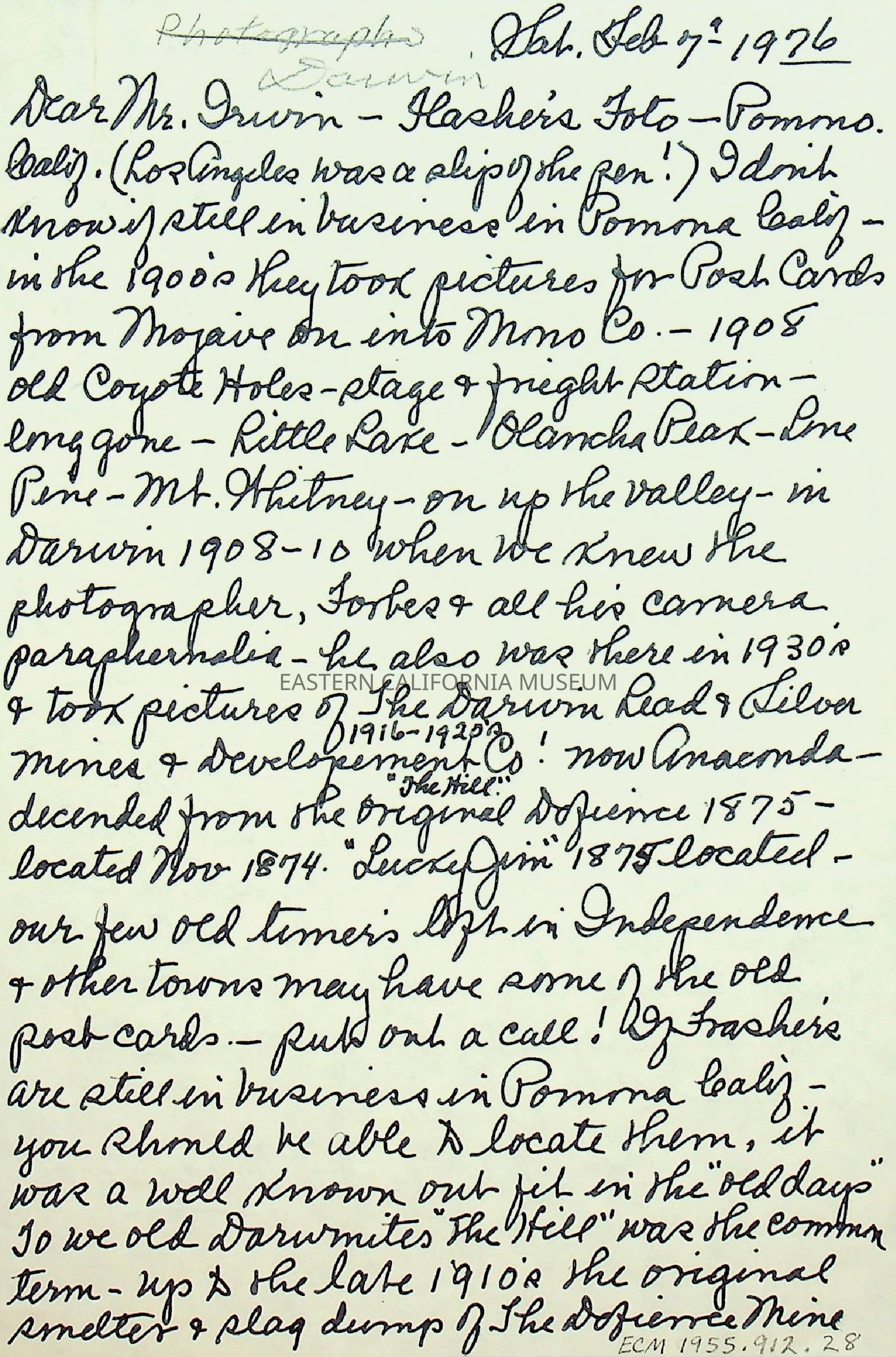 One page, double sided letter from Elizabeth L. Mecham to [Charles] Irwin on 02/07/1976.