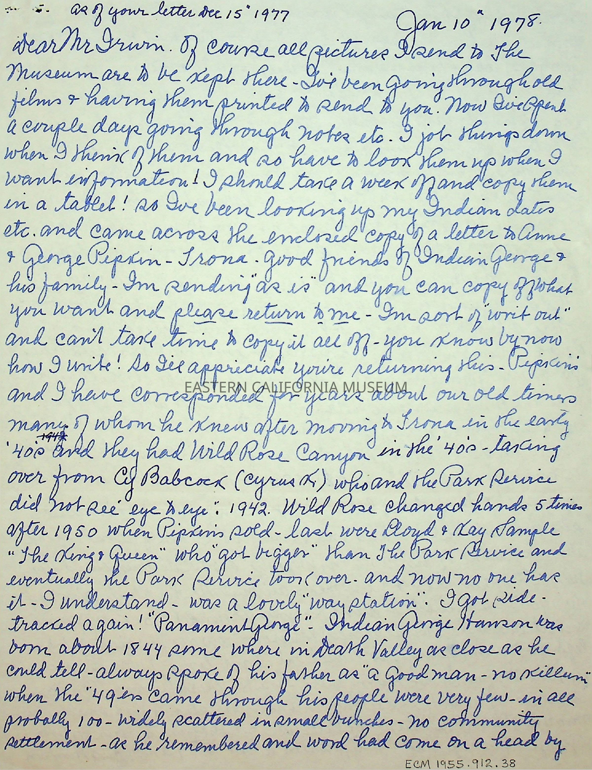 Two page, double sided letter from Elizabeth L. Mecham to [Charles] Irwin on 01/10/1978. It references an enclosed copy of a letter to Anne and George Pipkin, possibly 1955.912.9.Collection