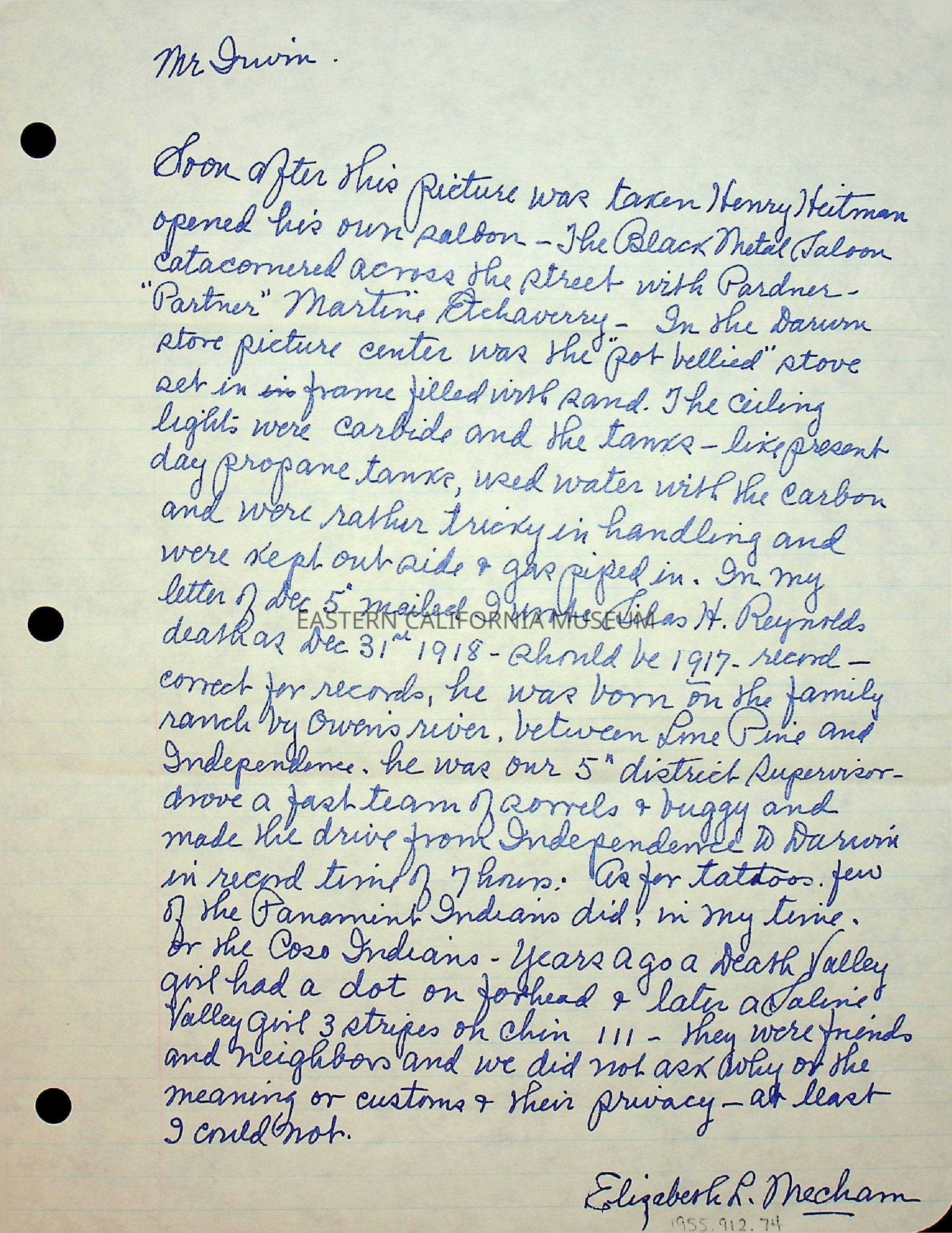 Three page, single sided letter from Elizabeth L. Mecham to [Charles] Irwin, no date. Possibly dates around early December 1979 as it seems like it could have been sent shortly after letter 1955.912.70 which was dated 12/01/1979. This letter included a copy of a photo previously sent to the museum (1975.17.5), so this photo will not be given a new accession number but filed with the original.Collection