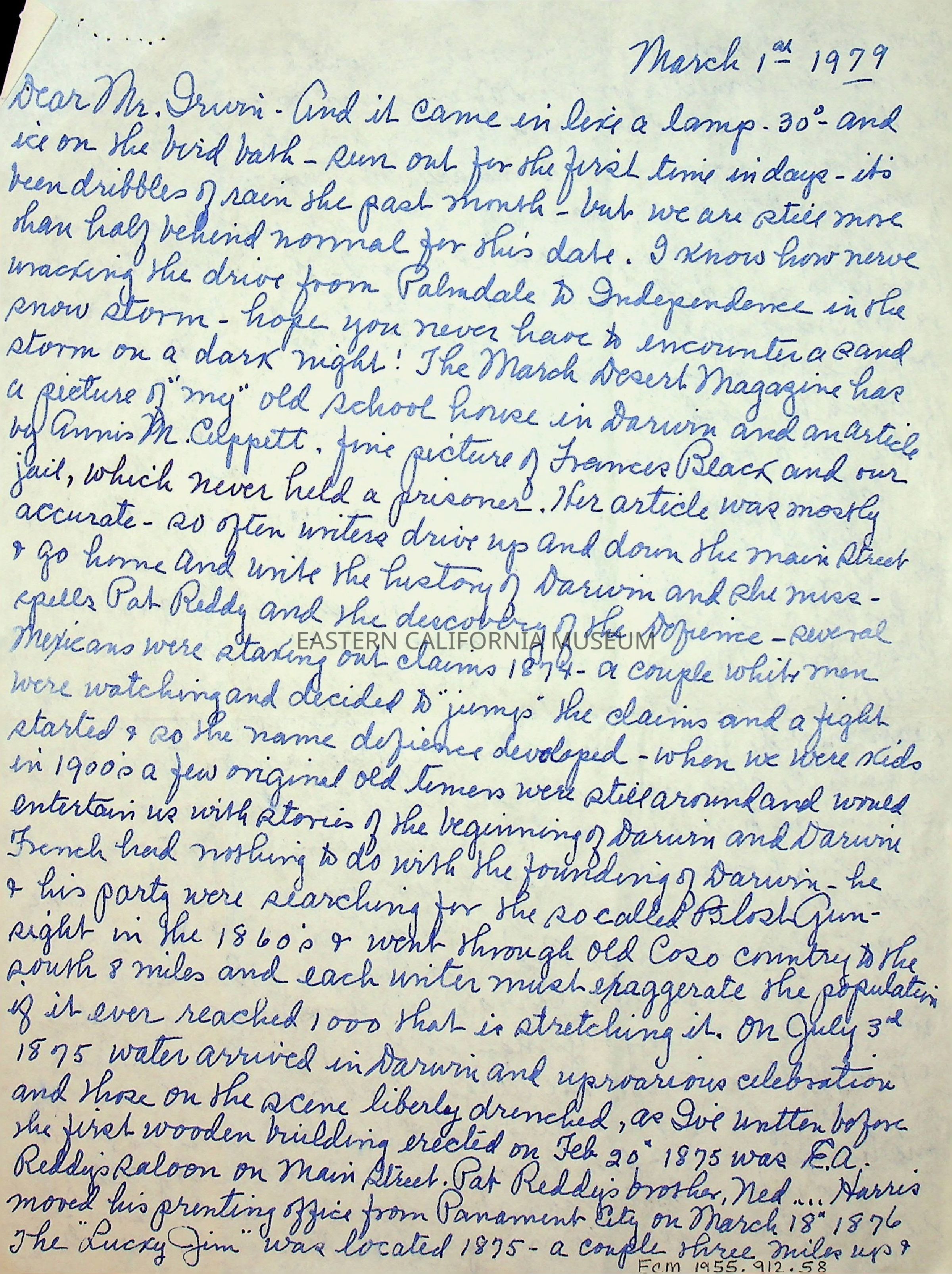 Five page, double sided letter from Elizabeth L. Mecham to [Charles] Irwin on 03/01/1979.