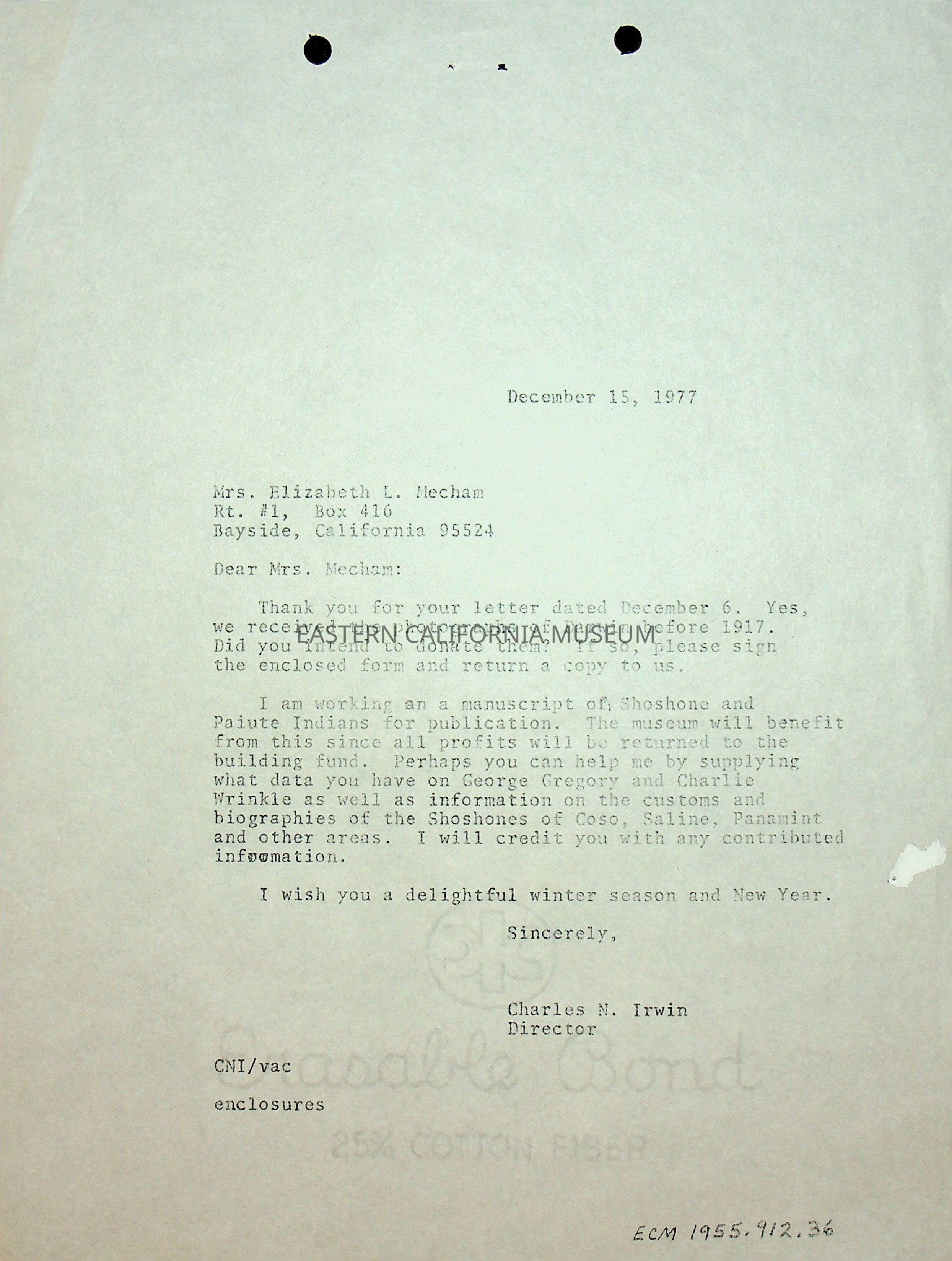 One page, single sided typewritten letter from Charles Irwin to Elizabeth L. Mecham on 12/15/1977.