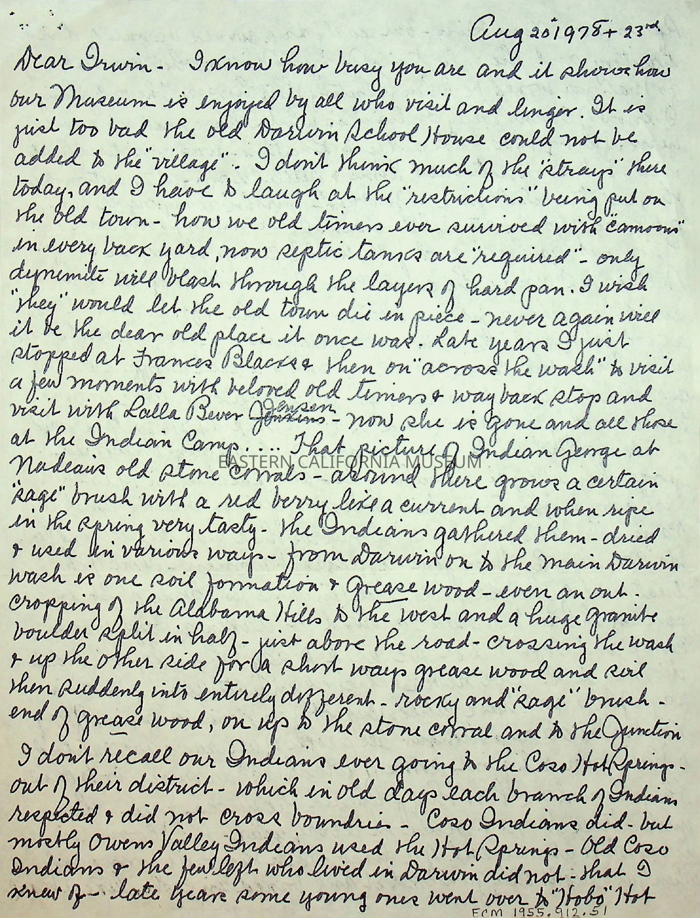 Two page, double sided letter from Elizabeth L. Mecham to [Charles] Irwin on 08/20/1978. Has envelope with the letter.
