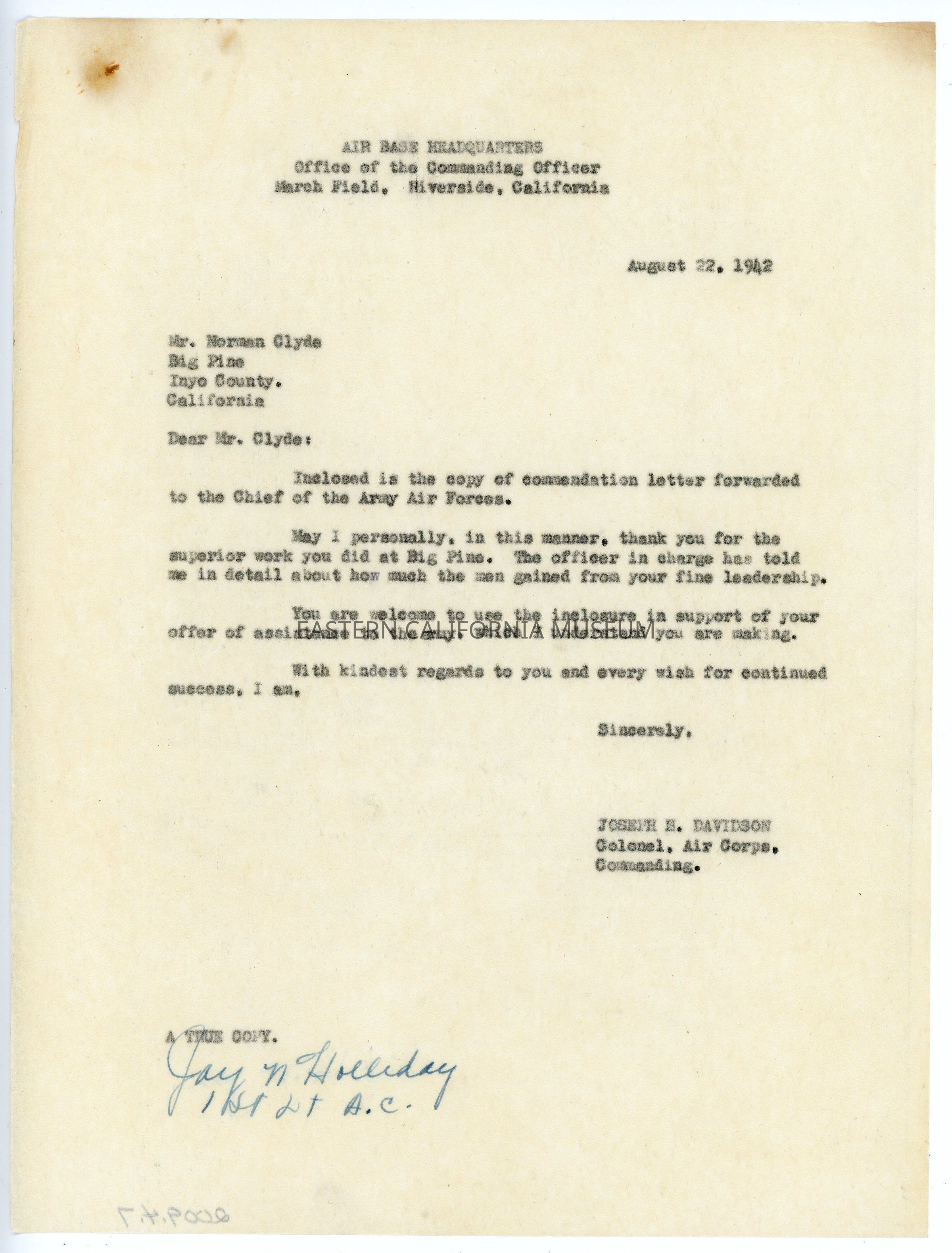 Typewritten cover letter from Joseph Davidson, Colonel, Air Corps, to Norman Clyde sent with a copy of the commendation letter forwarded to the Chief of the Army Air Forces. It is dated 08/22/1942 and is "A True Copy."