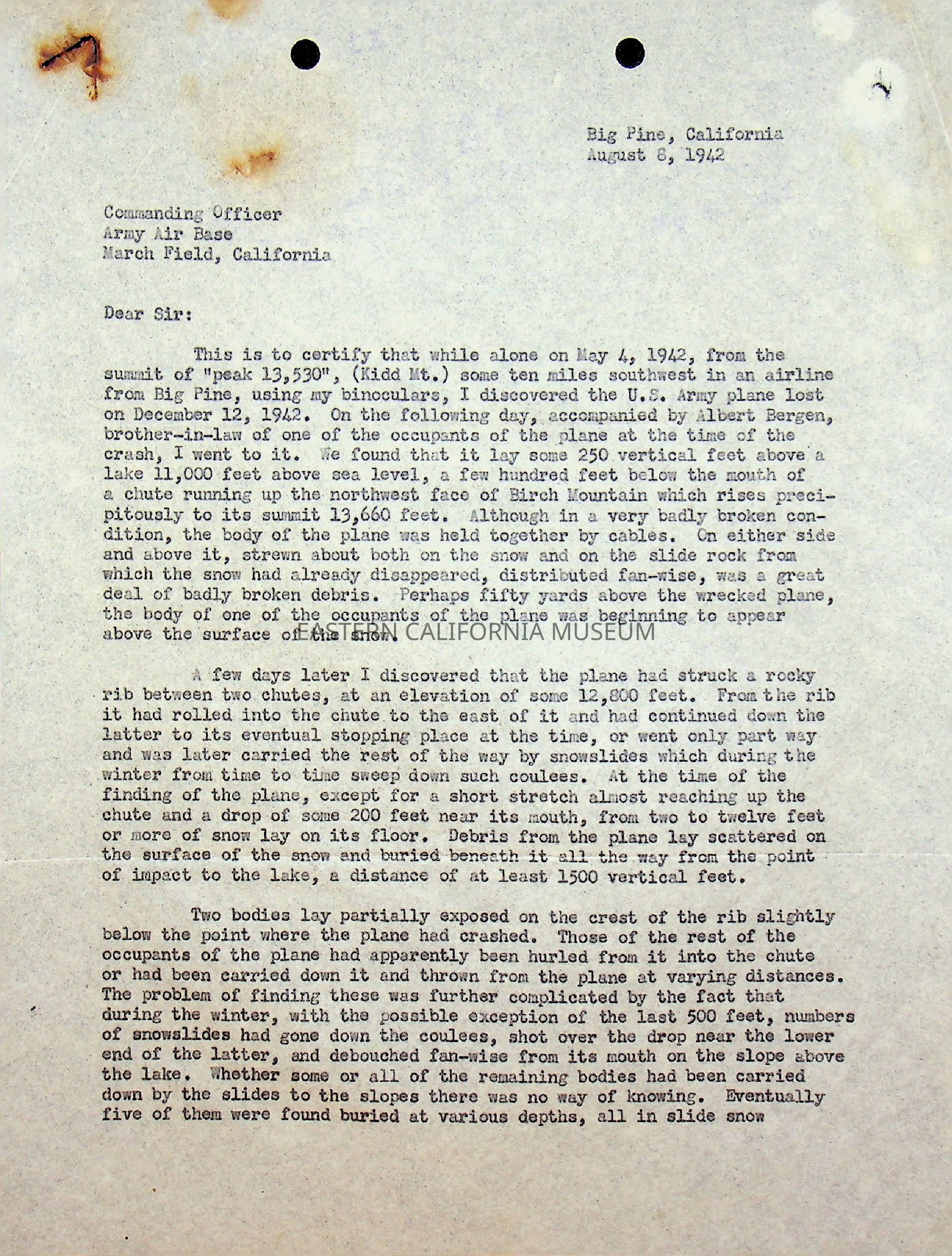 Two page typewritten letter from Norman Clyde to the Commanding Officer of the Army Air Base at March Field, CA dated 08/08/1942. It it to notify/certify that on 05/04/1942 Norman Clyde discovered the U.S. Army plane lost on 12/12/1941 flown by Maj. Gen. Herbert A. Dargue.Collection