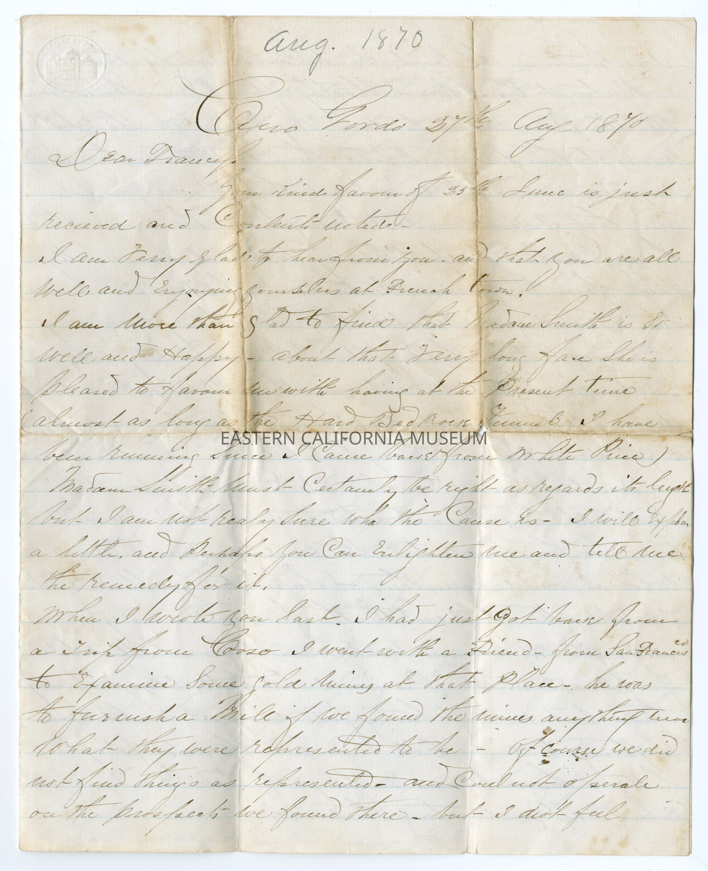 When I wrote you last, I had just got back from a trip from Coso. I went with a friend from San Francisco to examine some gold mines at that place. He was to furnish a mill if we found the mines anything near what they were represented to be. Of course we did not find things as represented, and could not operate on the prospects we found there. But I didn’t feel disappointed in the least, so it could not be that.