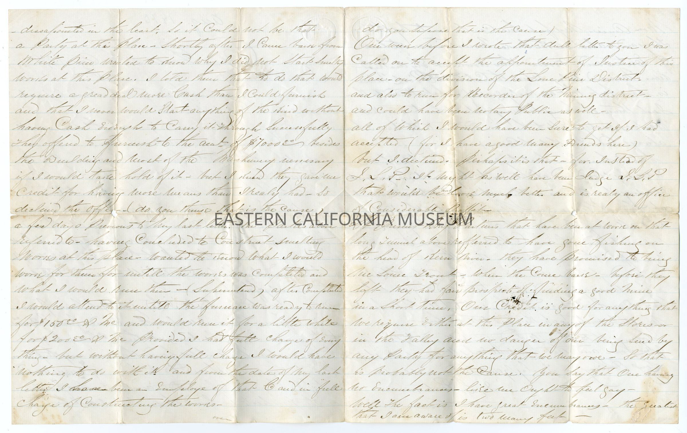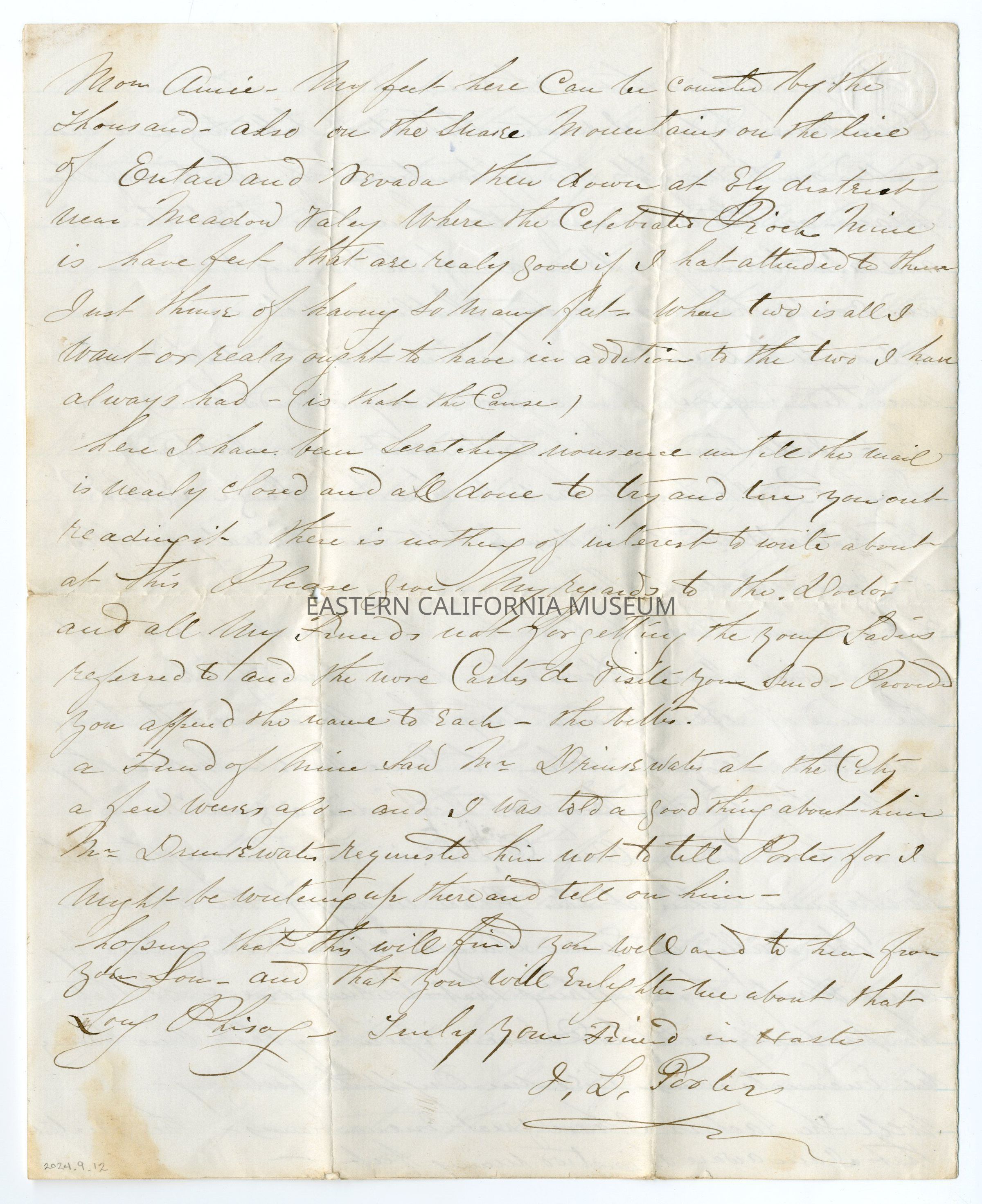 One week before I wrote that dull letter to you, I was called on to accept the appointment of Justice of this place, on the division of the Lone Pine District. And also to run for Recorder of the Mining District. And could have been Notary Public as well. All of which I would have been sure to get if I had accepted (for I have a good many friends here), but I declined. Perhaps it is that. For instead of J.L.P. it might as well have been Judge J.L.P. That would be and look much better, and is really an office of considerable profit.