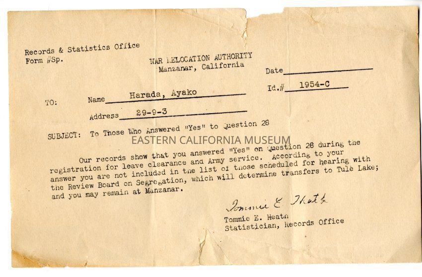 A letter or memo from the WRA's Records & Statistics Office (Tommie E. Heath, Statistician) to Claire Ayako Harada (ID #1954-C, Address 29-9-3) regarding her answer to Question 28. The text reads: "Our records show that you answered "Yes" on Question 28 during the registration for leave clearance and Army service. According to your answer you are not included in the list of those scheduled for hearing with the Review Board on Segregation, which will determine transfers to Tule Lake; and you may remain at Manzanar."Collection