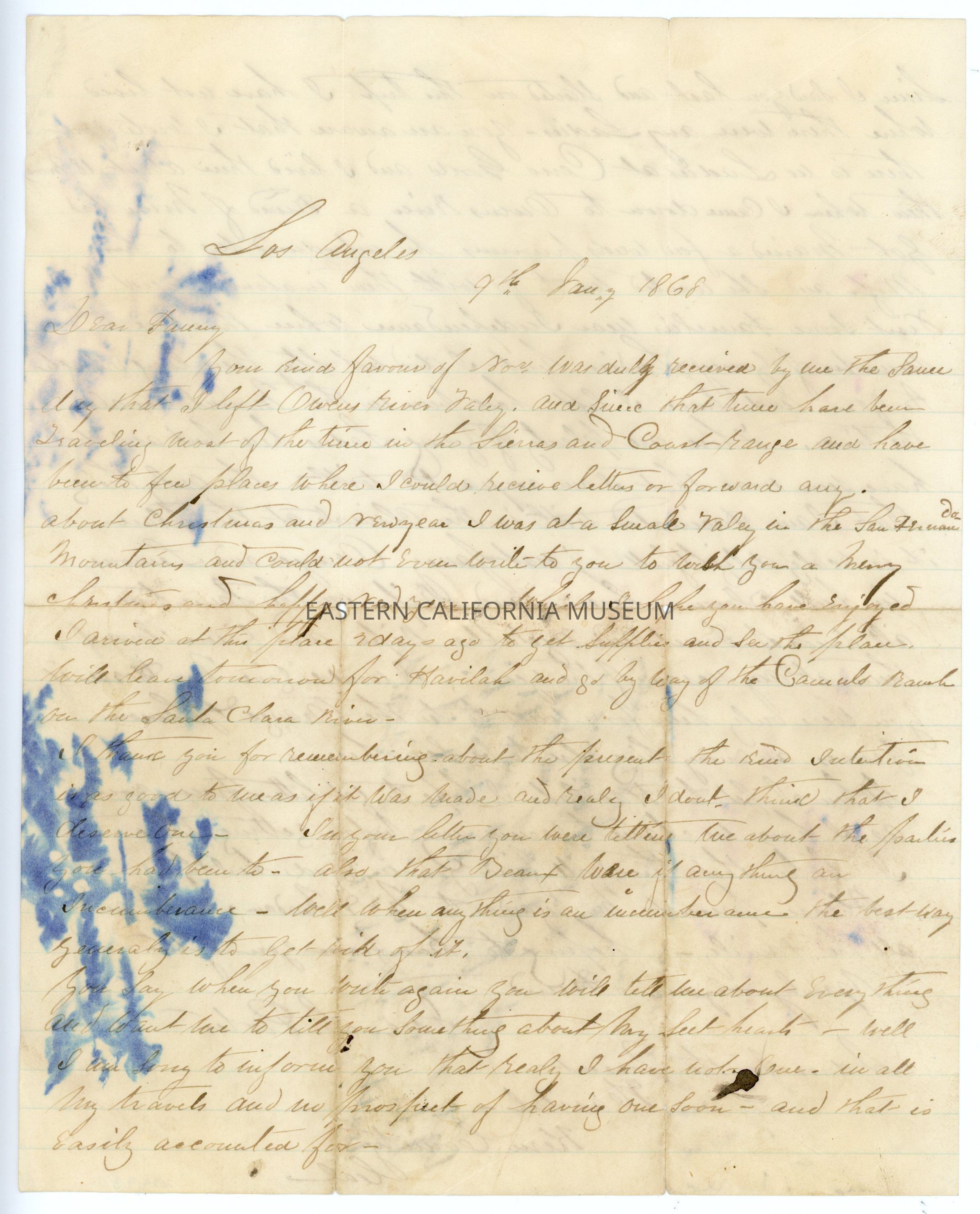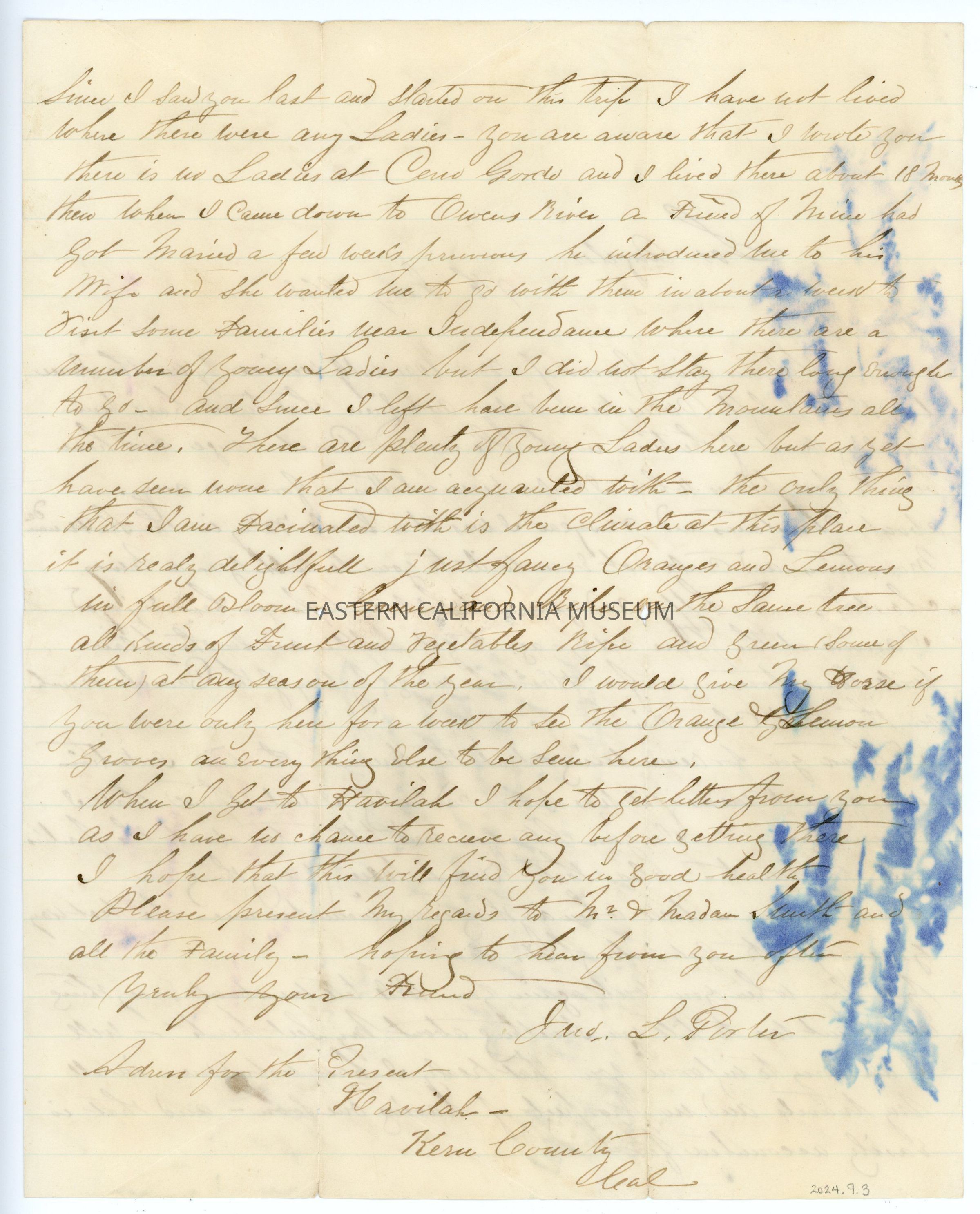 Since I saw you last and started on this trip I have not lived where there were any ladies. You are aware that I wrote you there is no ladies at Cerro Gordo and I lived there about 18 months. Then when I came down to Owens River a friend of mine had got married a few weeks previous. He introduced me to his wife and she wanted me to go with them in about a week to visit some families near Independence where there are a number of young ladies but I did not stay there long enough to go—and since I left have been in the mountains all the time. There are plenty of young ladies here but as yet have seen none that I am acquainted with. The only thing that I am fascinated with is the climate at this place—It is really delightful. Just fancy oranges and lemons in full bloom. Green and ripe on the same tree. All kinds of fruits and vegetables ripe and green (some of them) at any season of the year. I would give my horse if you were only here for a week to see the orange and lemon groves and everything else to be seen here.