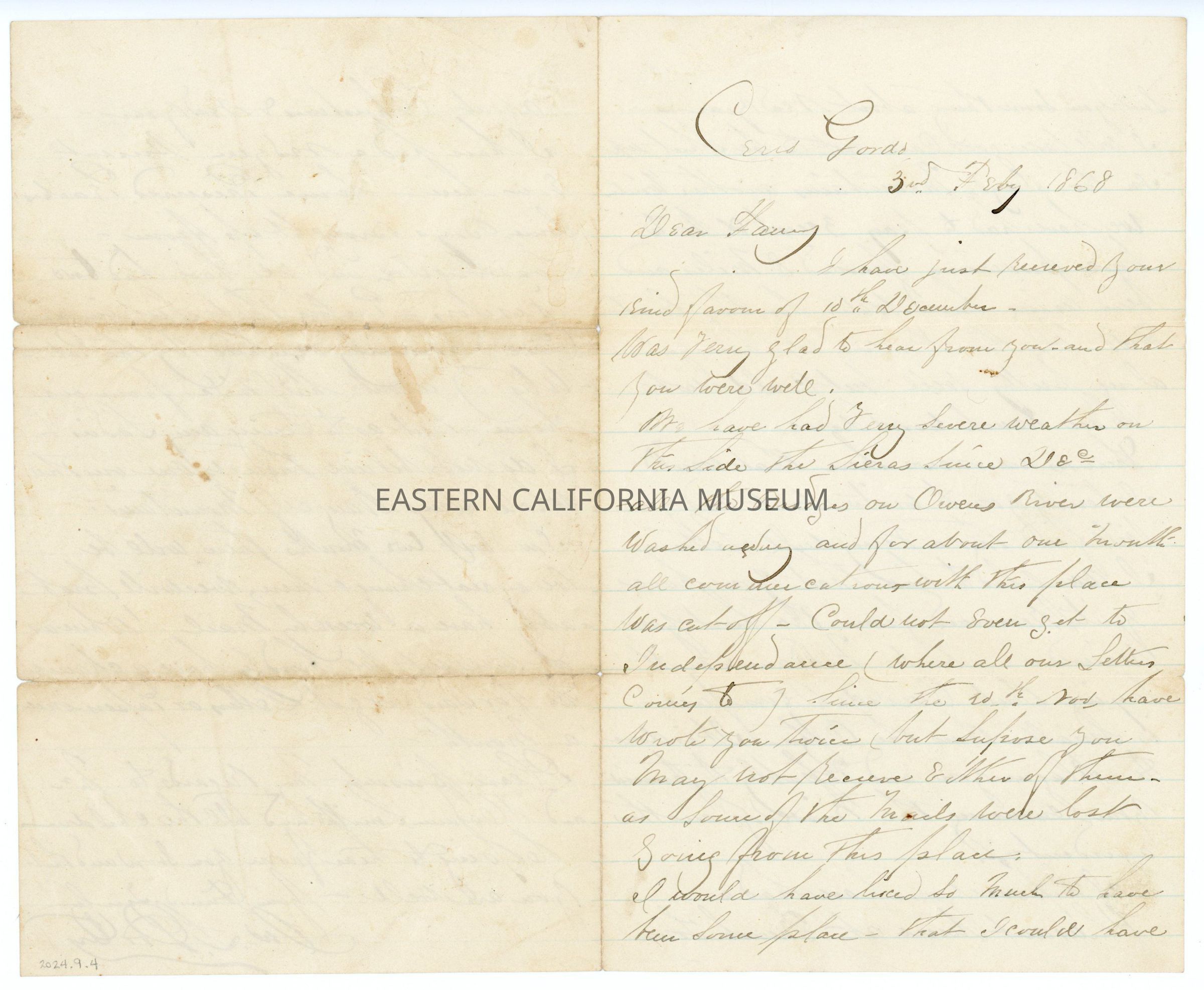 We have had very severe weather on this side the Sierras since Dec.—all the bridges on Owens River were washed away and for about one month all communications with this place was cut off. Could not even get to Independence (where all our letters come to). Since the 20th Nov. have wrote you twice, but suppose you may not receive either of them as some of the mails were lost going from this place.