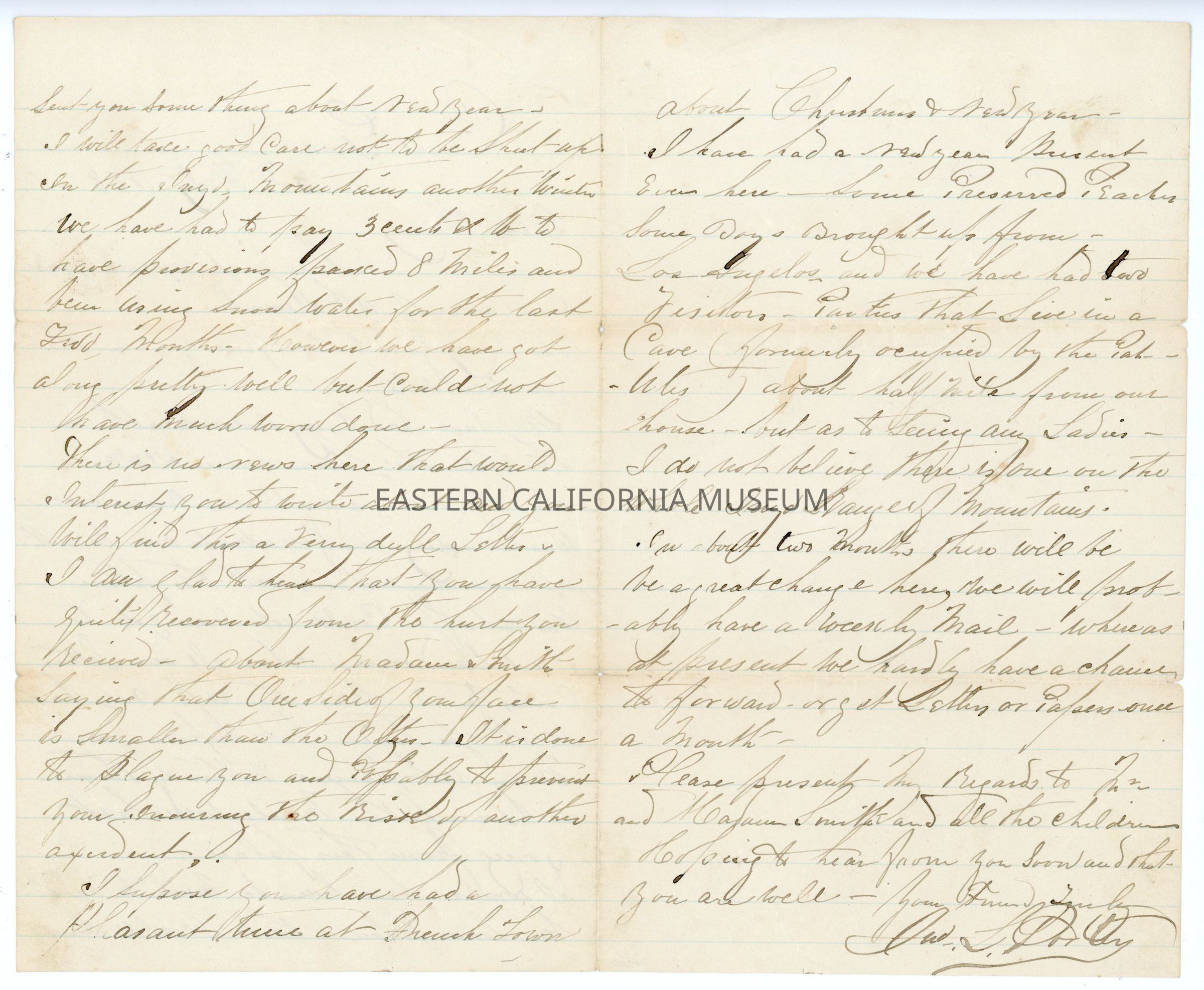 I suppose you have had a pleasant time at Frenchtown about Christmas and New Year. I have had a New Year present even here—some preserved peaches some boys brought from Los Angeles and we have had two visitors—parties that live in a cave (formerly occupied by the pack mules) about half mile from our house. But as to seeing any ladies, I do not believe there is one on the whole Inyo Range of mountains.