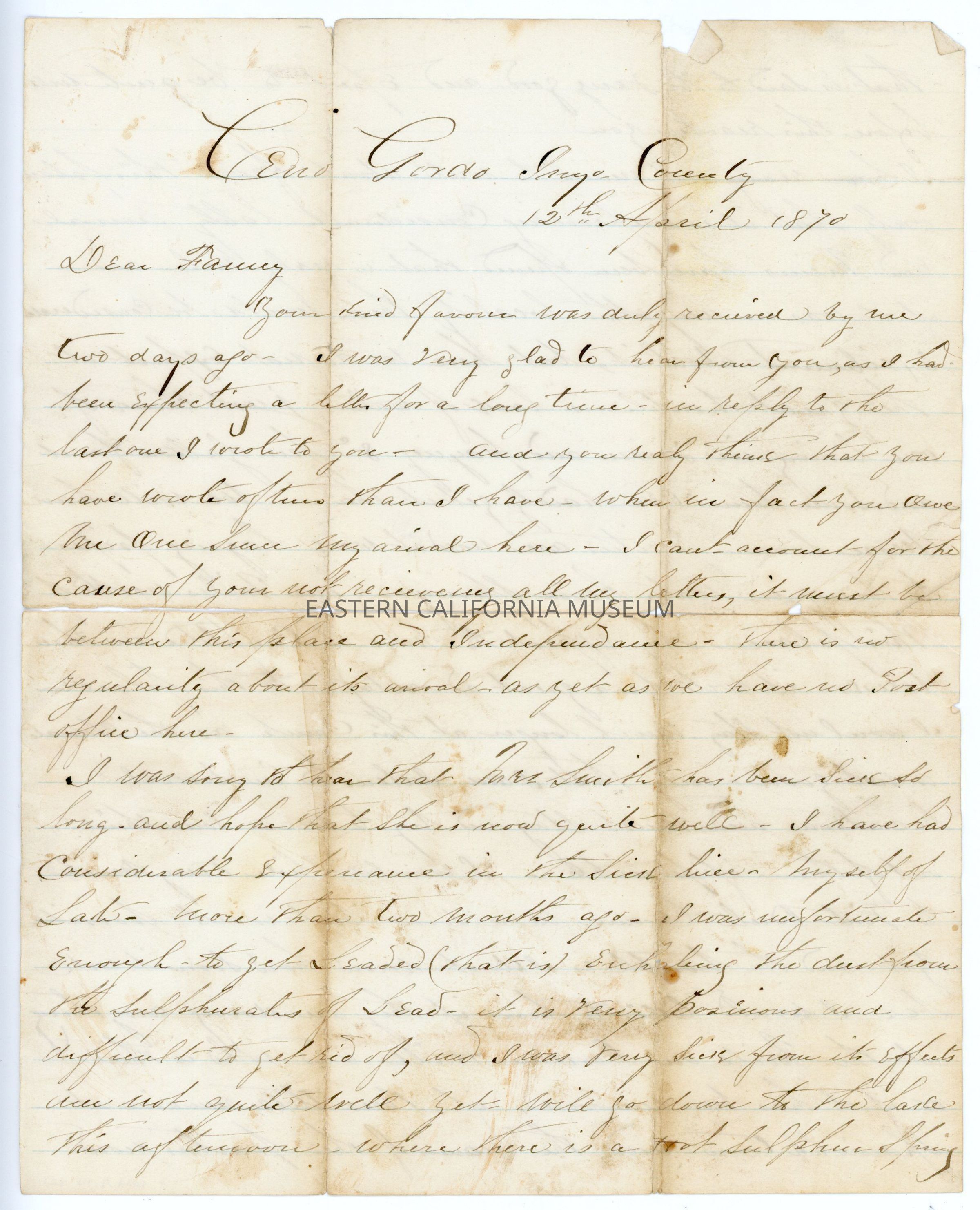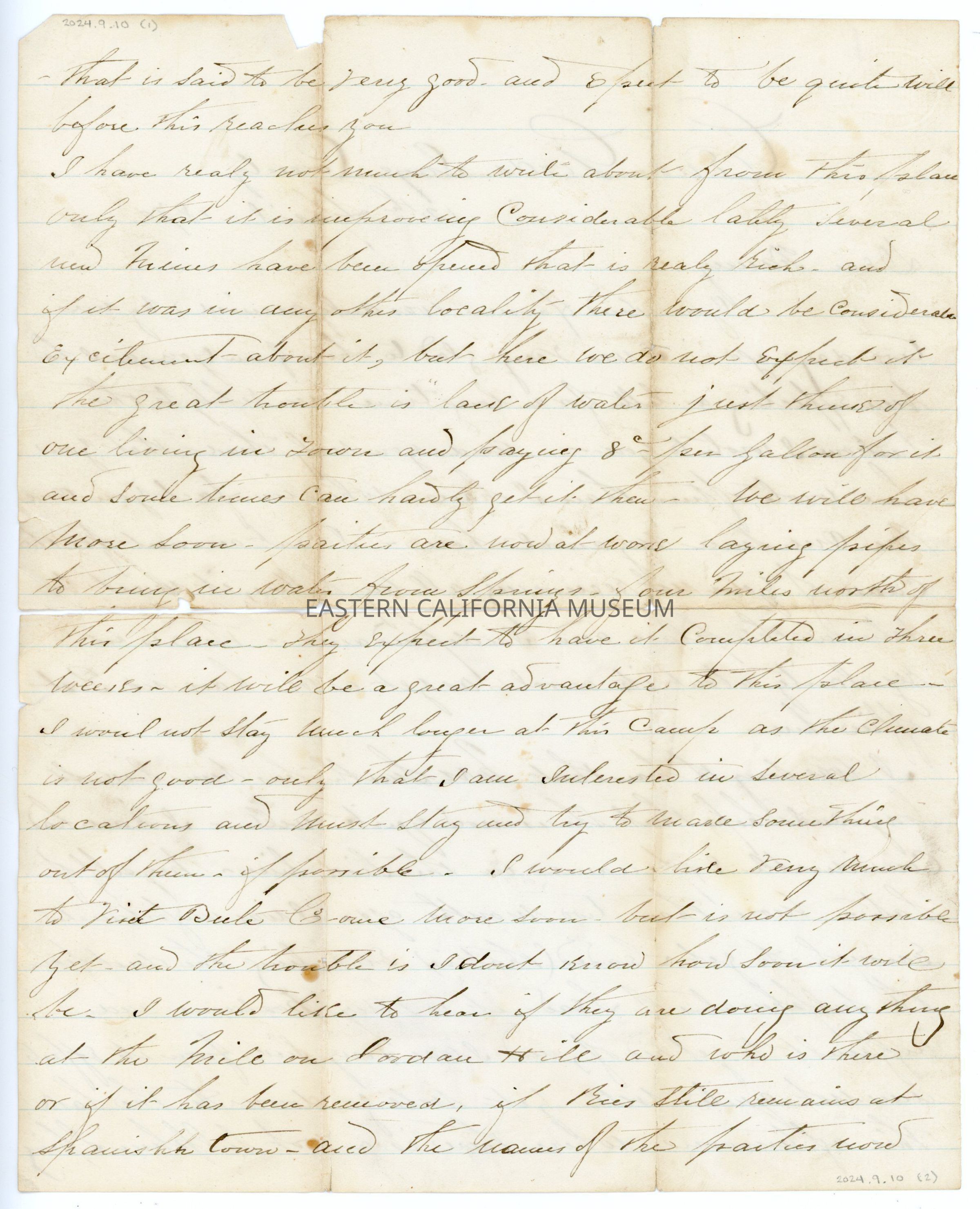 I have really not much to write about from this place, only that it is improving considerable lately. Several new mines have been opened that is really rich, and if it was in any other locality there would be considerable excitement about it, but here we do not expect it. The great trouble is lack of water. Just think of one living in town and paying 8 cents per gallon for it, and sometimes can hardly get it then. We will have more soon. Parties are now at work laying pipes to bring in water from springs four miles north of this place. They expect to have it completed in three weeks. It will be a great advantage to this place. I would not stay much longer at this camp as the climate is not good, only that I am interested in several locations and must stay [illegible, near?] by to make something out of them if possible.