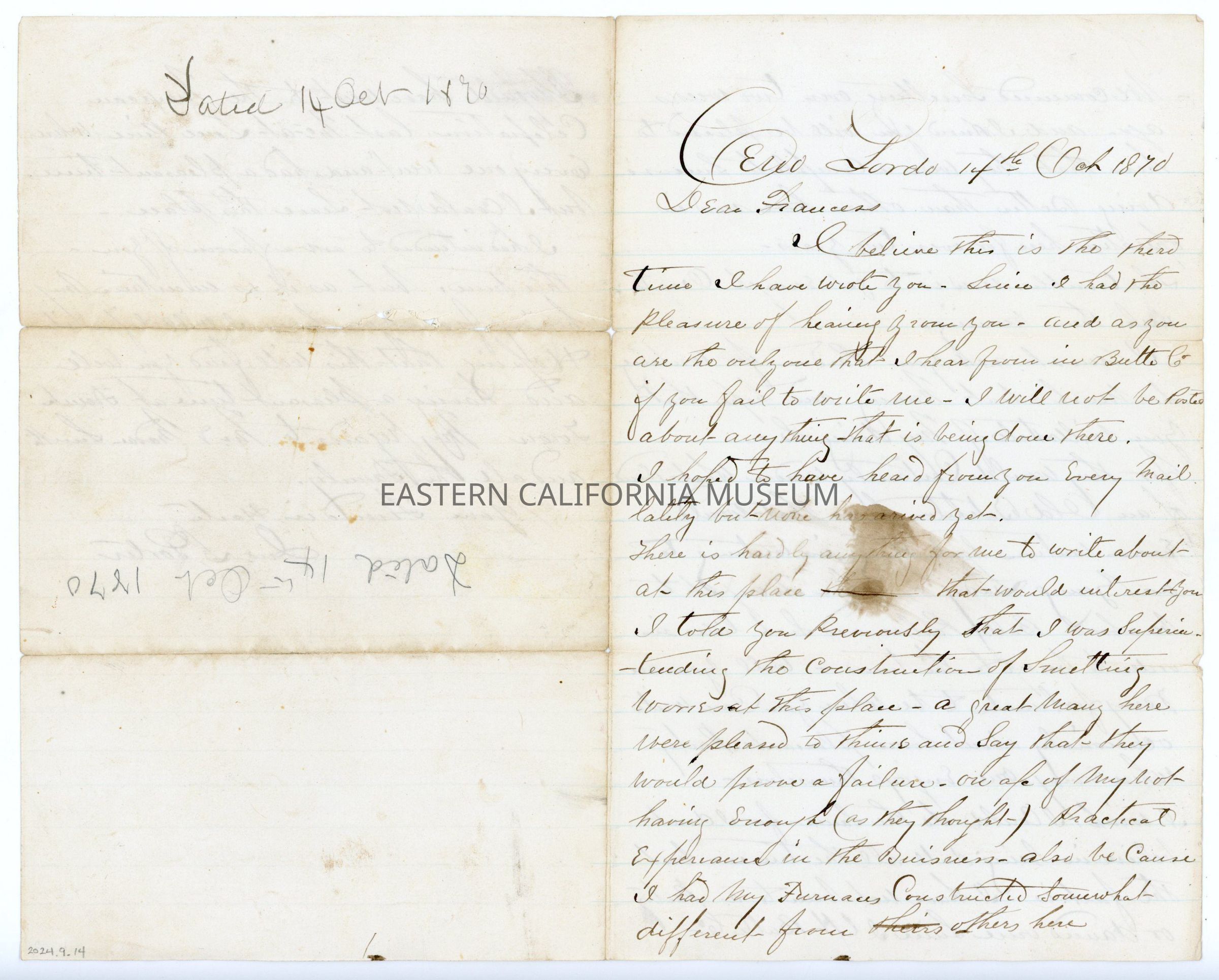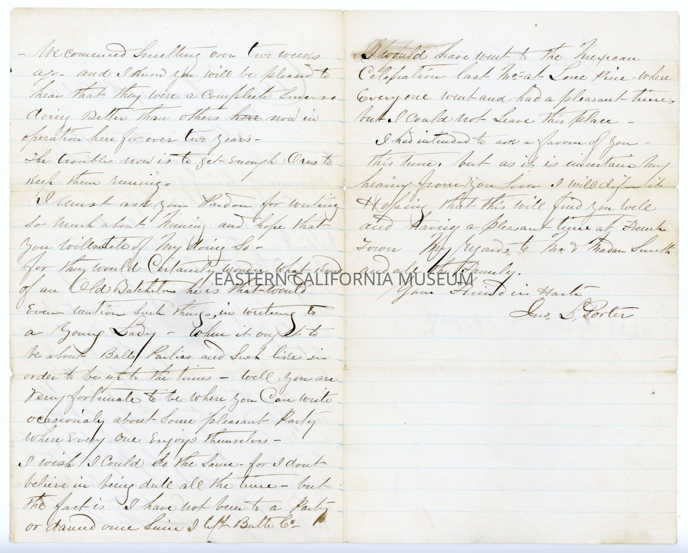 I must ask your pardon for writing so much about mining, and hope that you will not tell of my doing so for they would certainly wonder what kind of an old bachelor he is that would even mention such things in writing to a young lady, when it ought to be about balls, parties, and suchlike in order to be up to the times. Well you are very fortunate to be where you can write occasionally about some pleasant party where everyone enjoys themselves. I wish I could do the same, for I don’t believe in being dull all the time. But the fact is I have not been to a party or danced once since I left Butte Co. I would have went to the Mexican celebration last month at Lone Pine, where everyone went and had a pleasant time, but I could not leave this place.