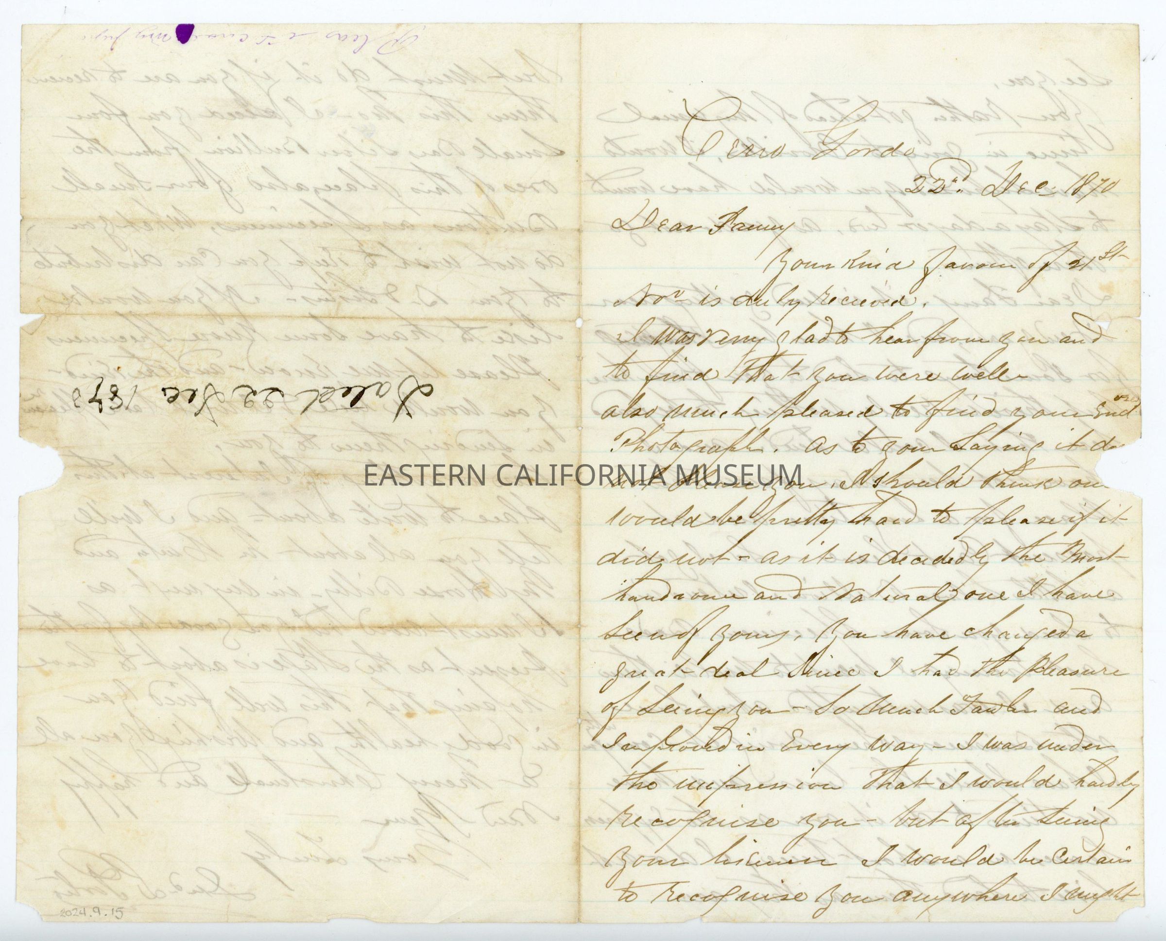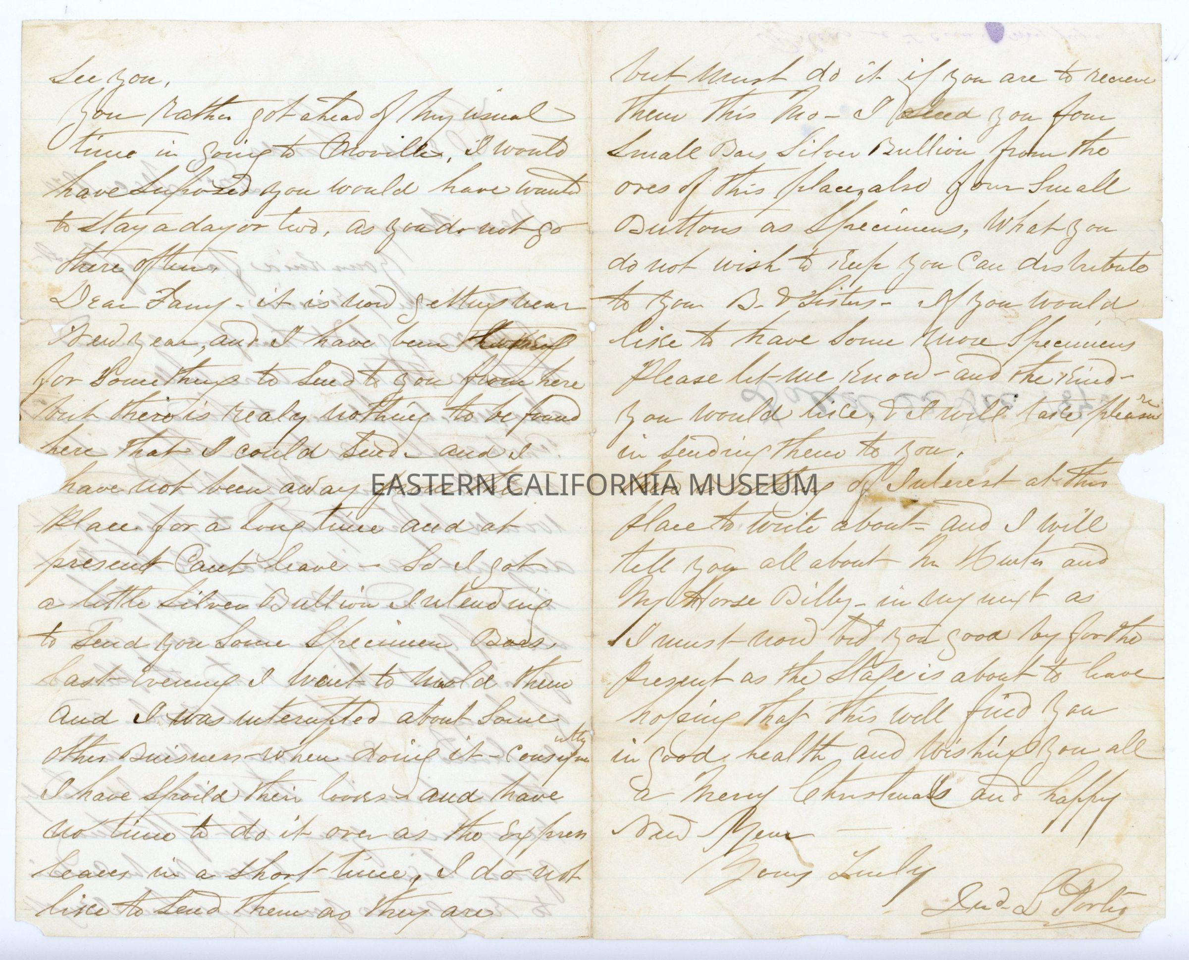 Dear Fanny, it is now getting near New Year, and I have been [illegible, looking?] for something to send to you from here, but there is really nothing to be found here that I could send. And I have not been away from this place for a long time, and at present can’t leave. So I got a little silver bullion intending to send you some specimen bars.