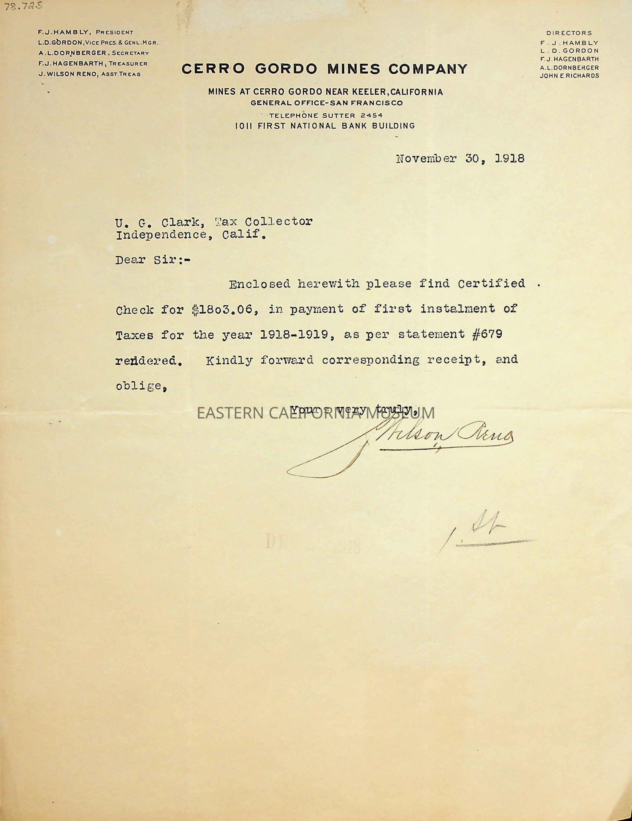 Letter to U. G. Clark, Tax Collector, from Wilson Reno, Assistant Treasurer of the Cerro Gordo Mines Company, dated November 30, 1918. Letter was accompanied by check #679 for first installment of taxes in 1918-1919 in the amount of $1,803.06.Made/Created