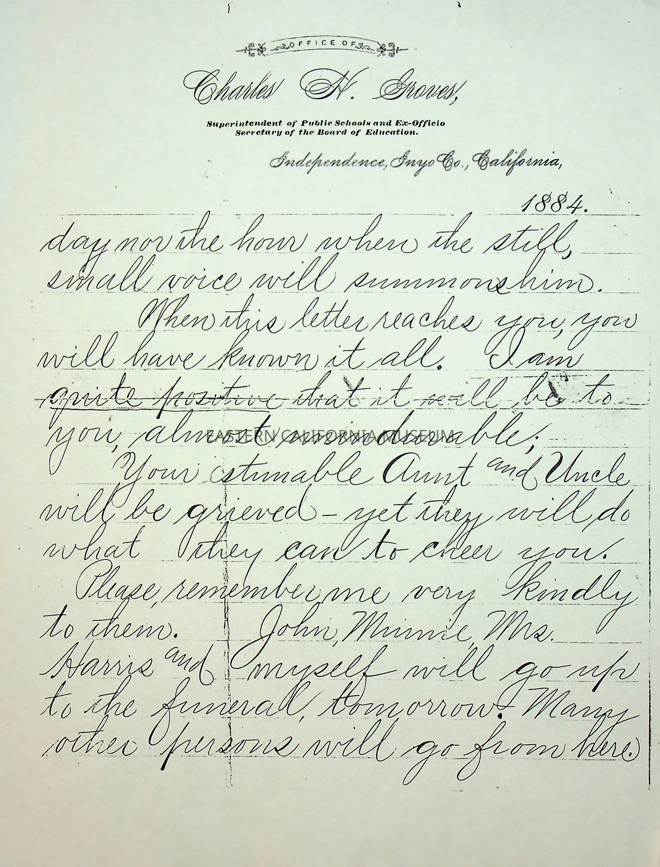Photocopy of the last page (doublesided) of a condolence letter written by Charles H. Groves, Superintendent of Public Schools. Likely sent to the Shepherd family upon learning the news of the death of Nellie Shepherd in 1884.