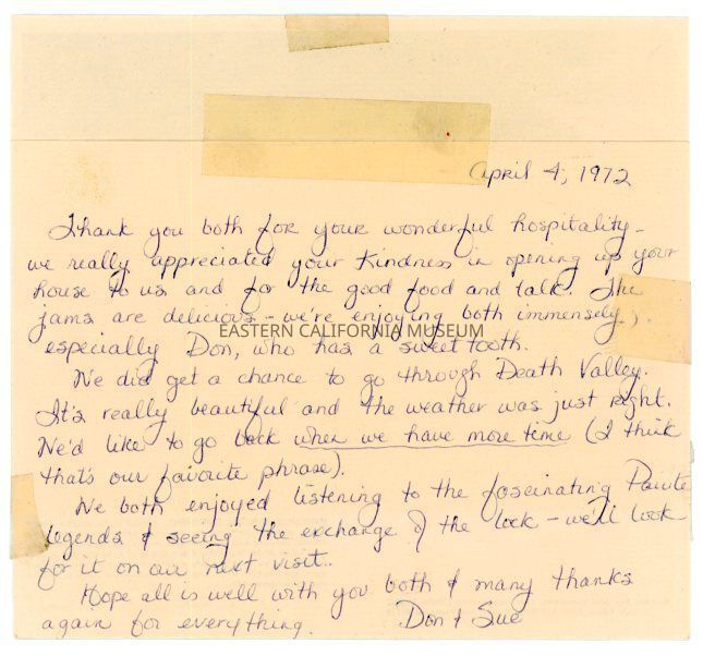 Thank you letter dated April 4, 1972 from Don and Sue (no last name). The reverse side has a photo of the Manzanar cemetery monument taken by Robert Nakamura.Collection