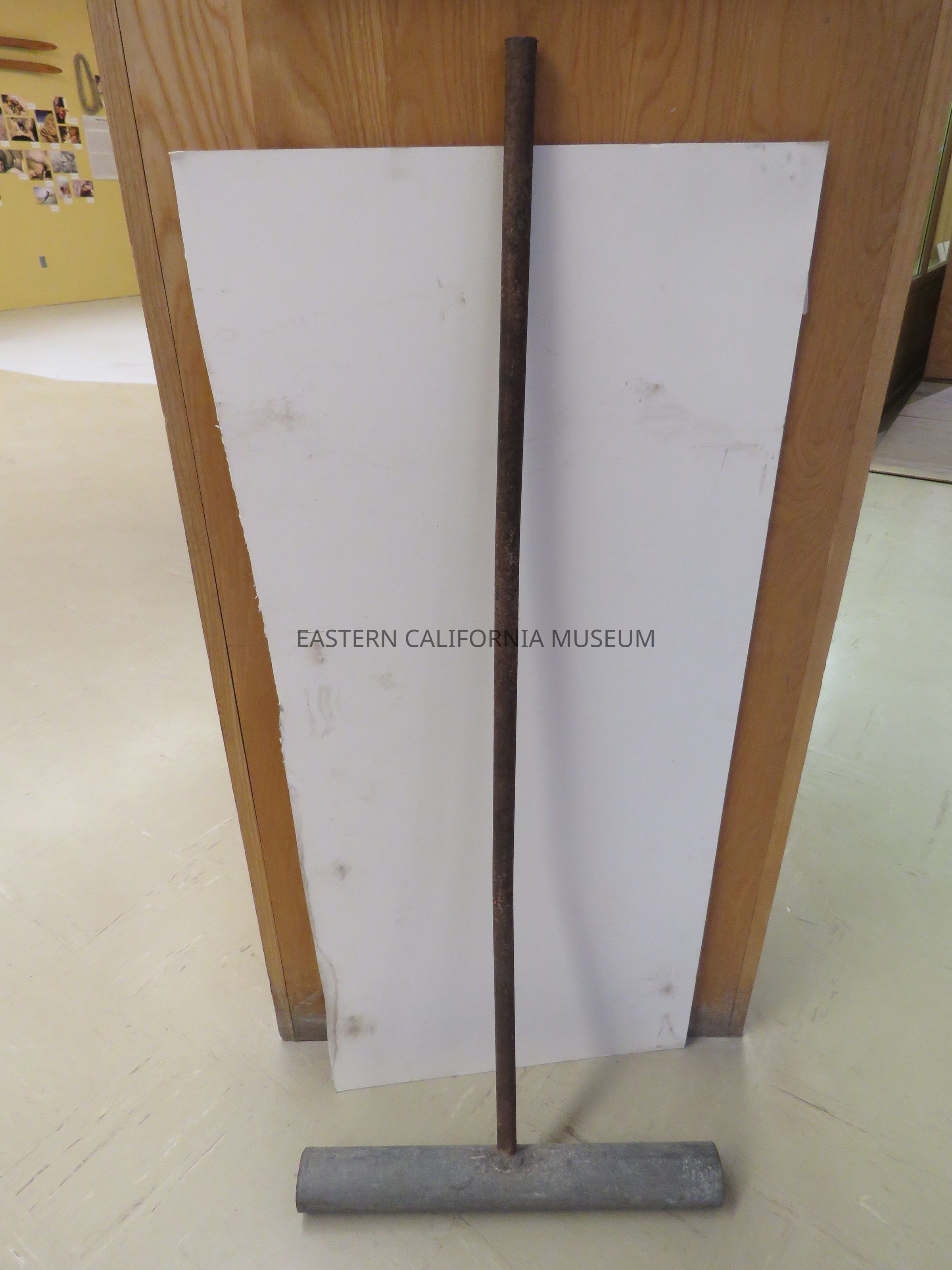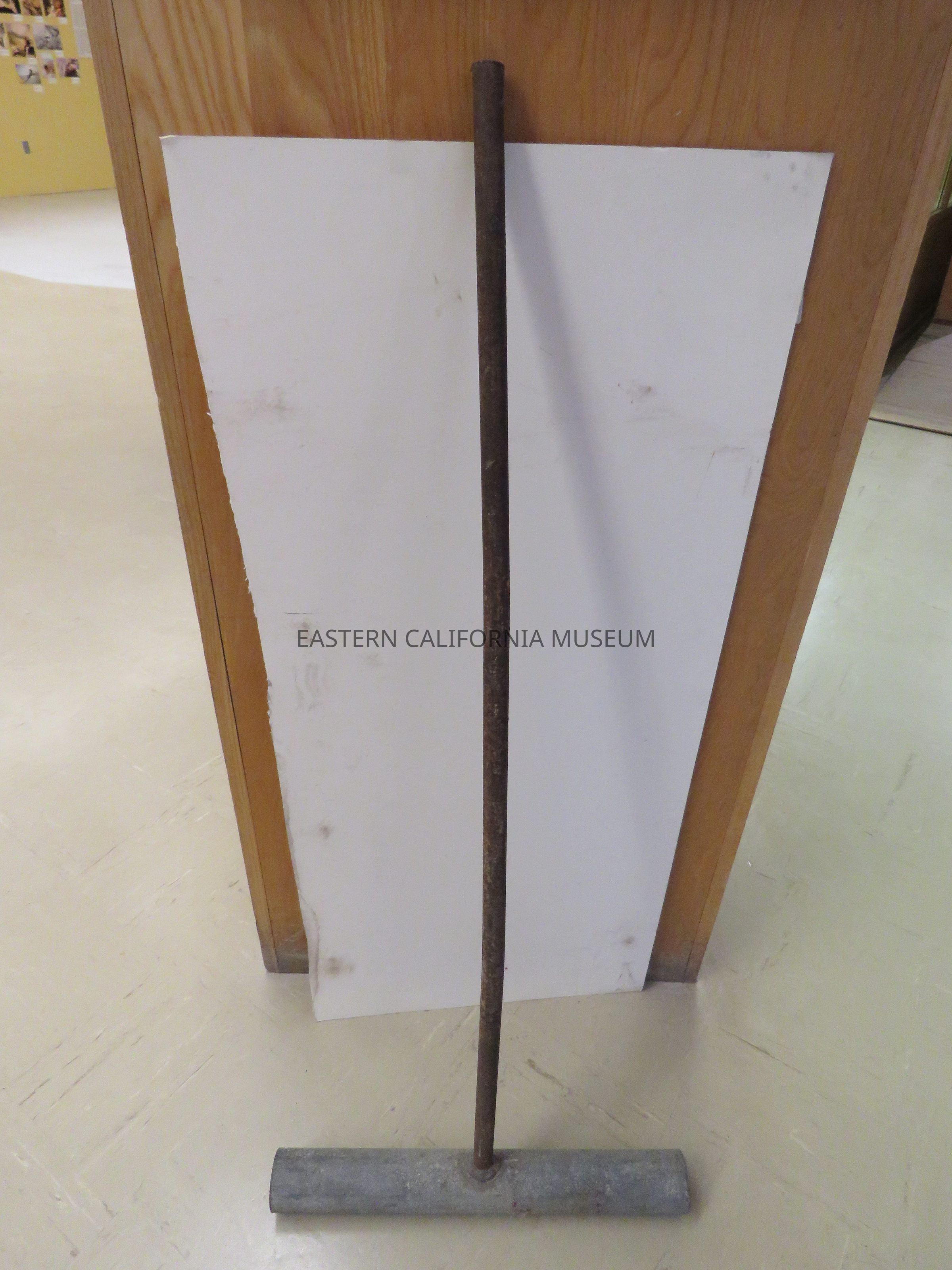 Metal tool used on golf courses to level or smooth sand. The metal handle a hollow pipe 40.5" long and welded to the head, which is a hollow galvanized pipe with 1/4" walls. It was likely made and used at Manzanar War Relocation Center.Collection