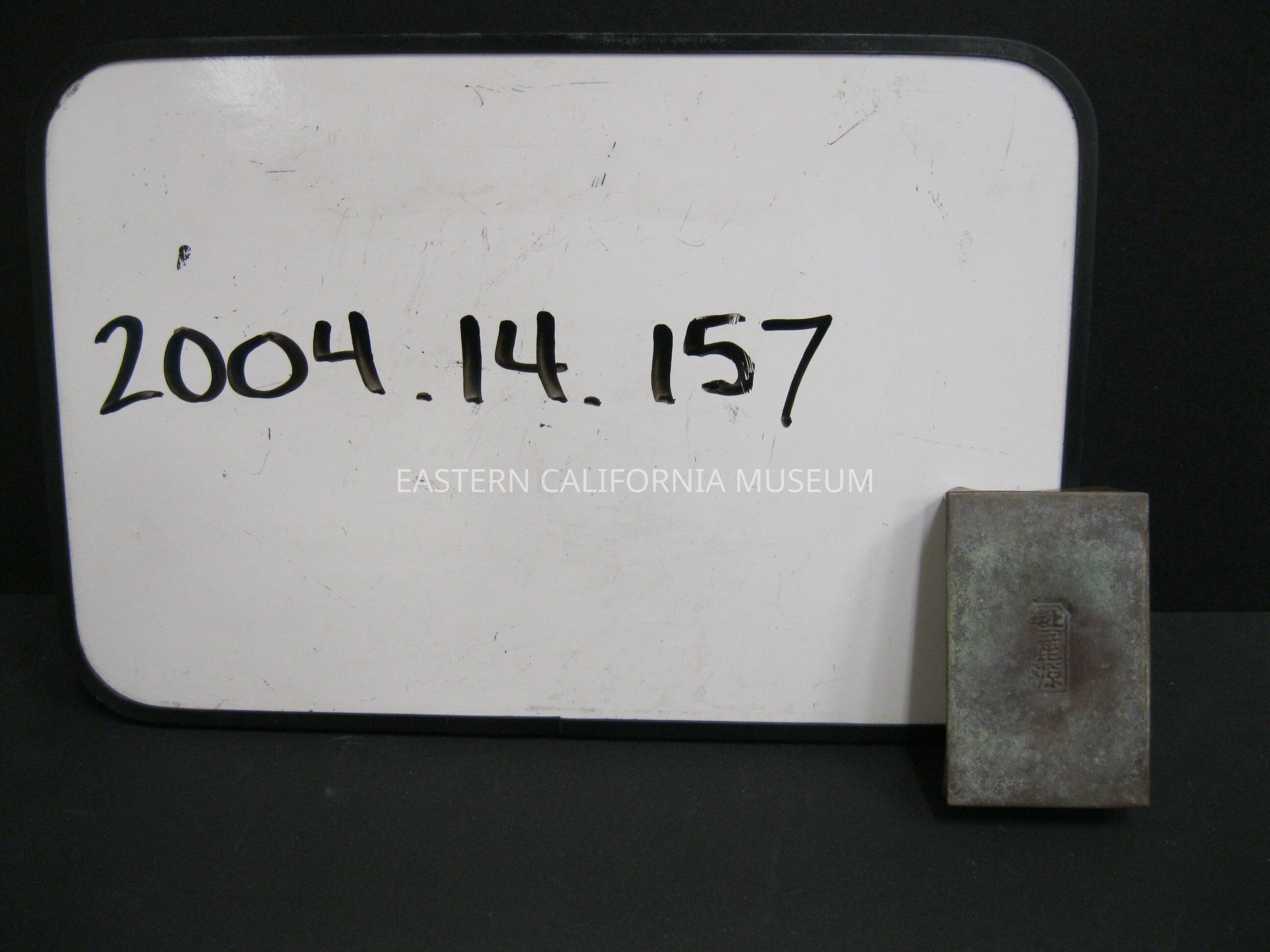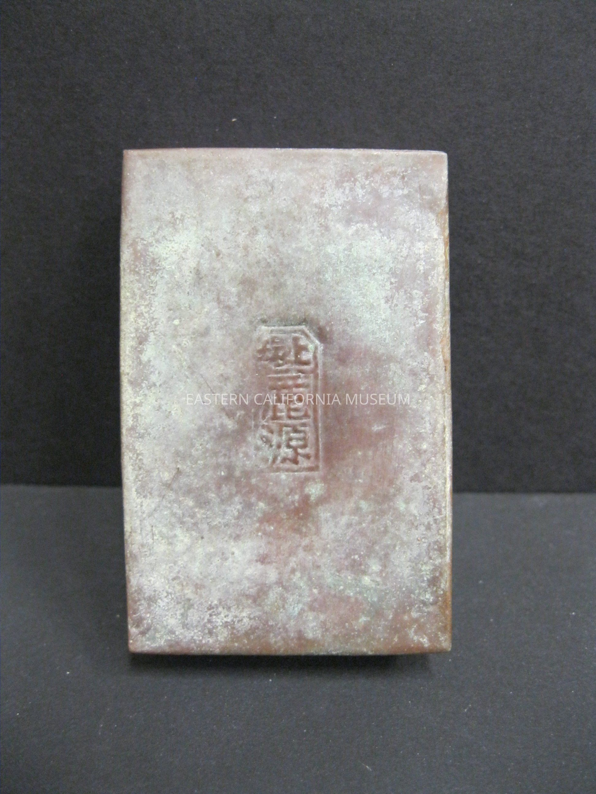 Metal opium can lid with a (Chinese?) logo stamp that represents the Lai Yuen brand of opium.