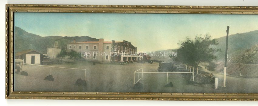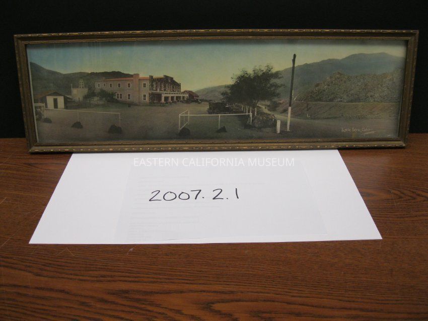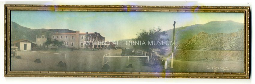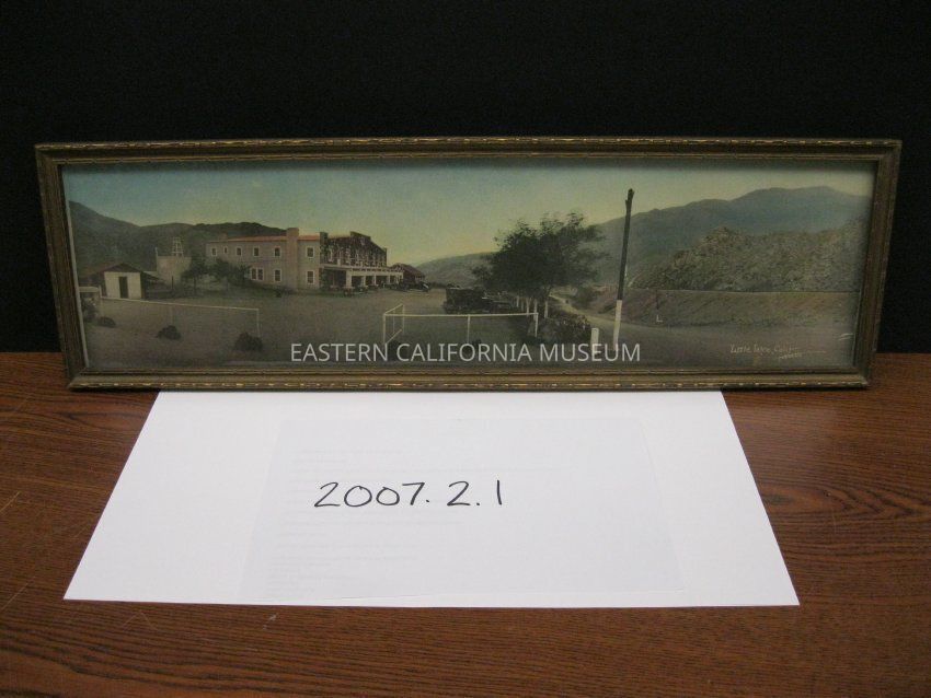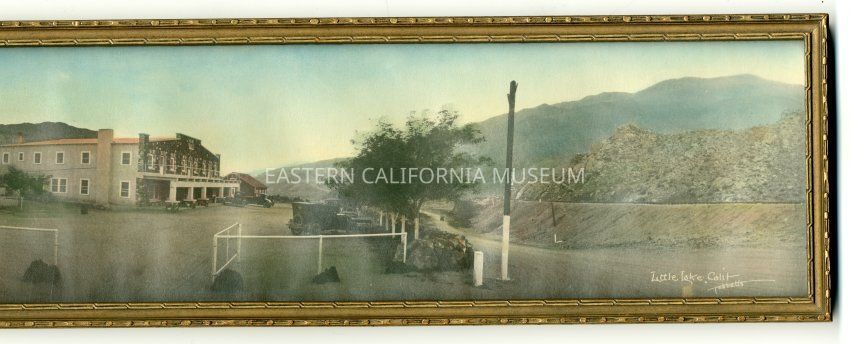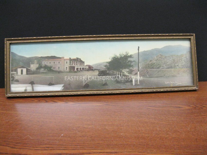 Framed, hand-tinted photograph titled, "Little Lake, Calif." taken by photographer Tebbetts. It shows the Little Lake Hotel, with its distinctive stone façade. Note from donor says, "Just after completion 1920s."Photograph Details