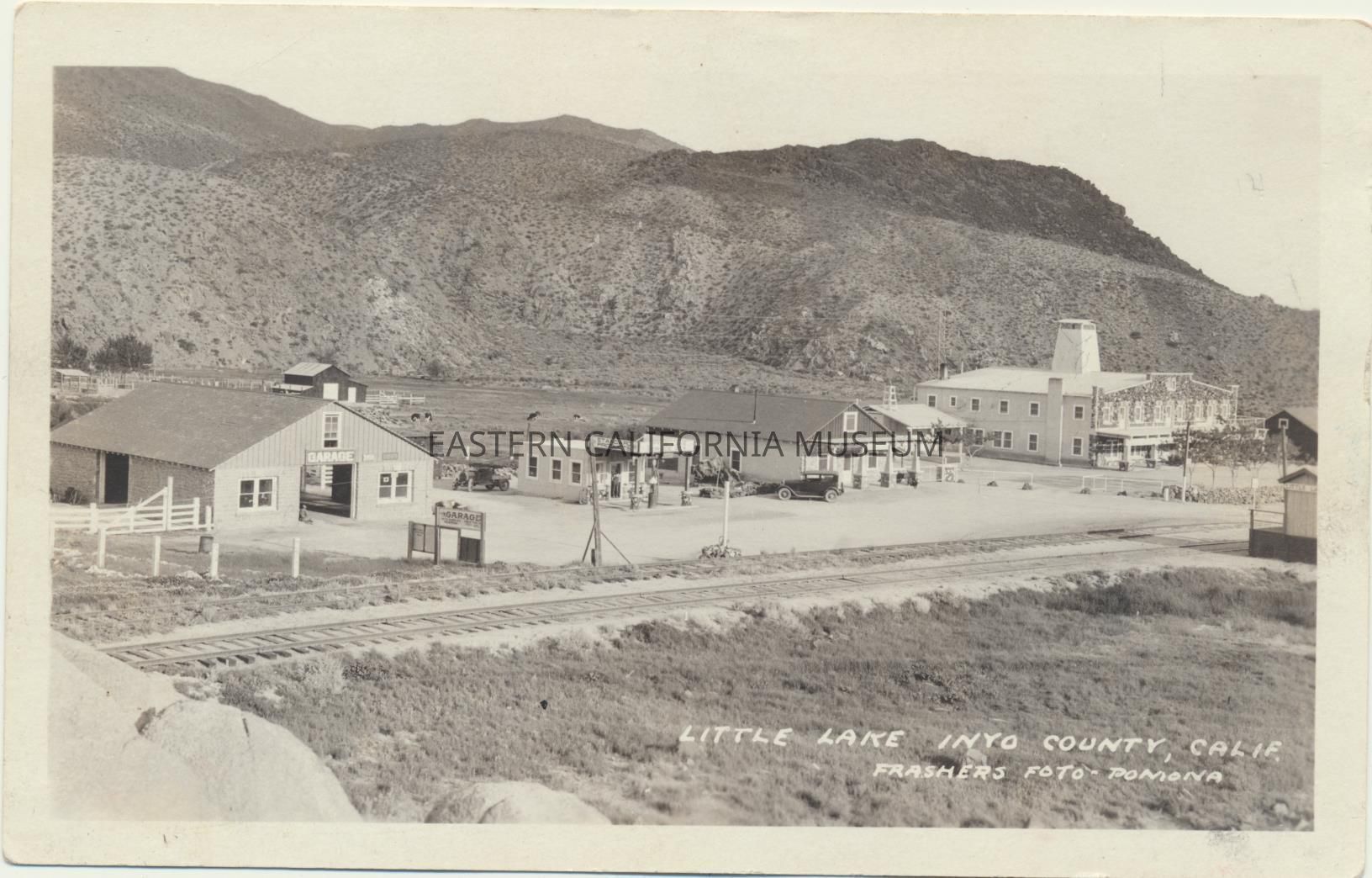 Photo postcard titled, "Little Lake, Inyo County, Calif." taken by photographer Burton Frasher. The garage and service station are the two buildings on the left and the hotel is on the right. Maybe the building in the center is a restaurant? Railroad tracks in foreground.Photograph Details