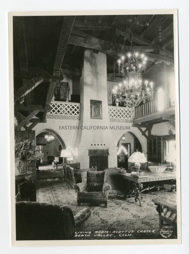Photo of the interior of Scotty's Castle. It is titled, "Living Room, Scotty's Castle, Death Valley, Calif." The photographer was Burton Frasher of Pomona.