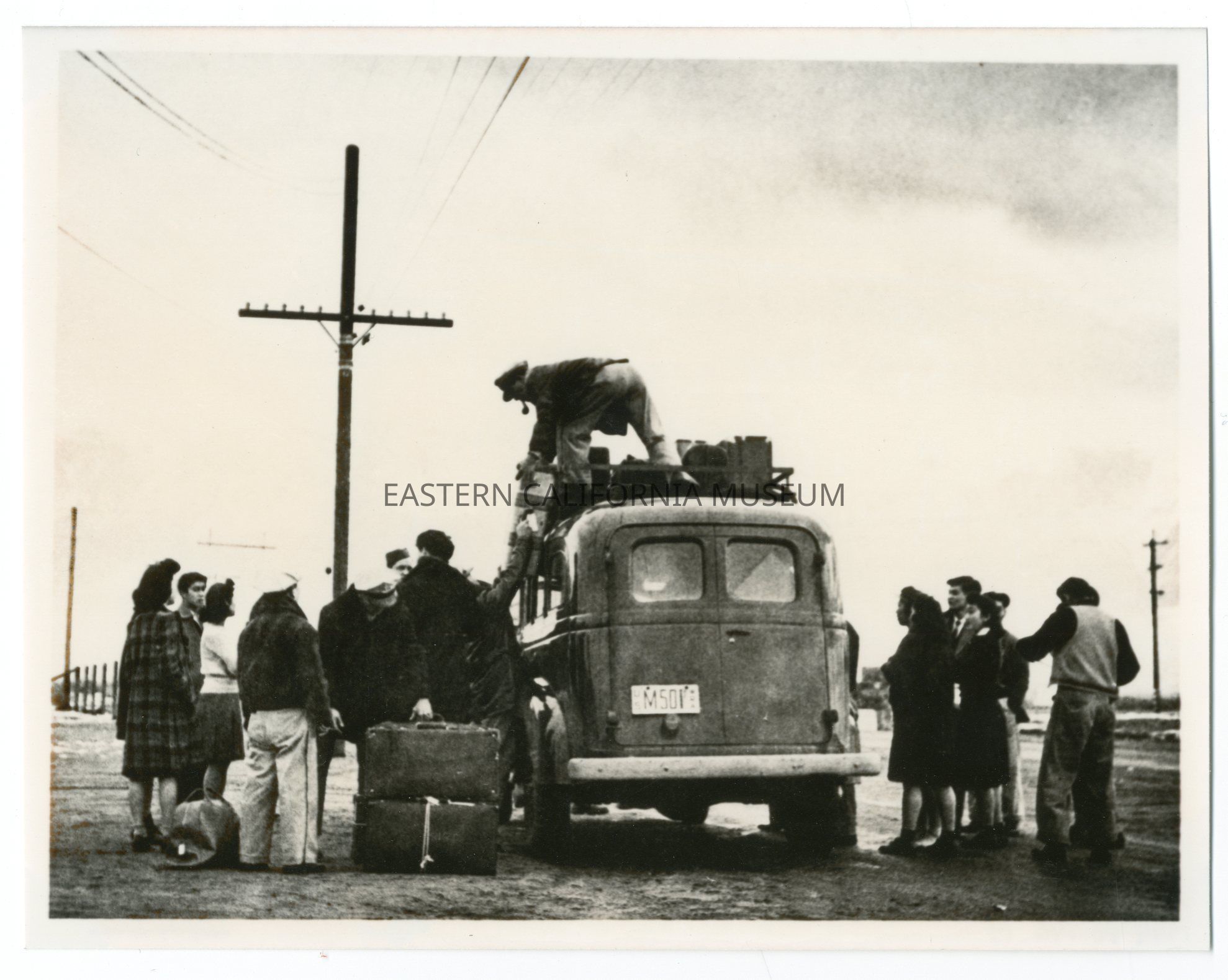 Copy of a photo of approximately 15 people loading luggage on top of a vehicle. It is an Ansel Adams photo of the vehicle that Nan Zischank drove as the "Official Manzanar Escort." This copy was printed in April 1984.Photograph Details