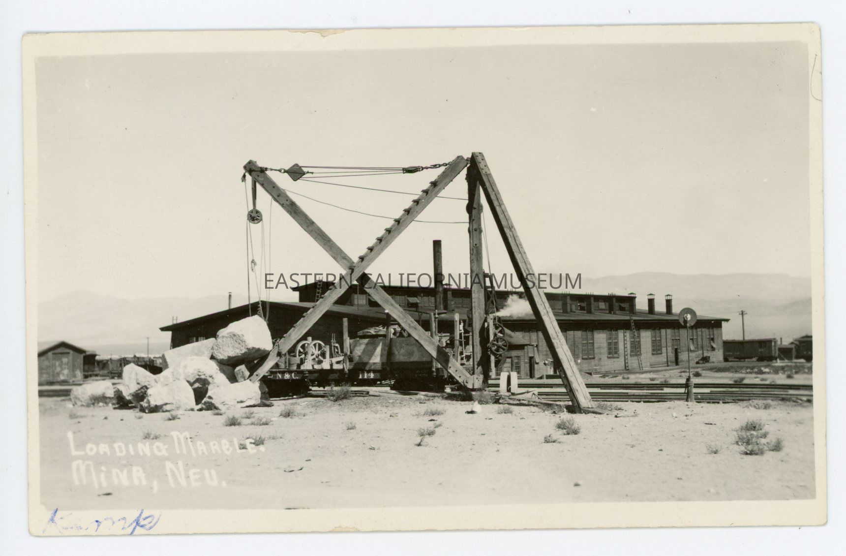 Photo postcard titled, "Loading Marble, Mina, Nev." It shows a large train station and a device [derrick?] used to hoist heavy loads. Written in blue ink along border is "Kemp."