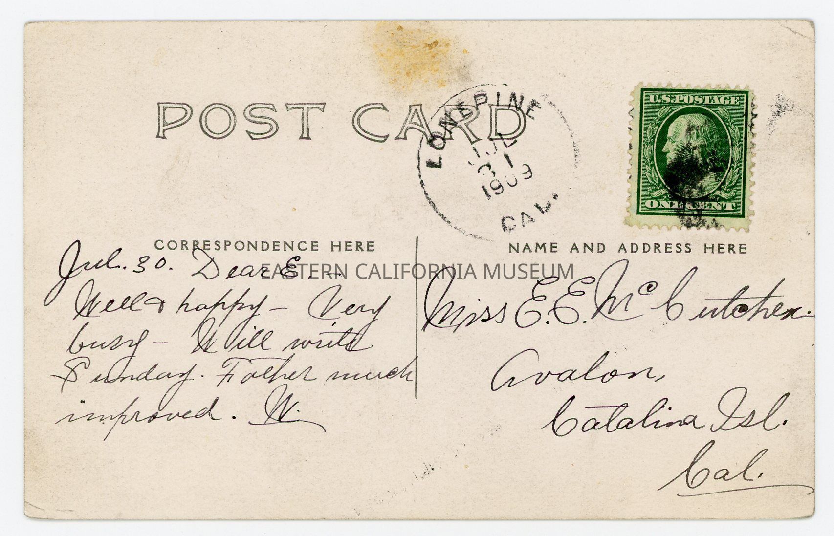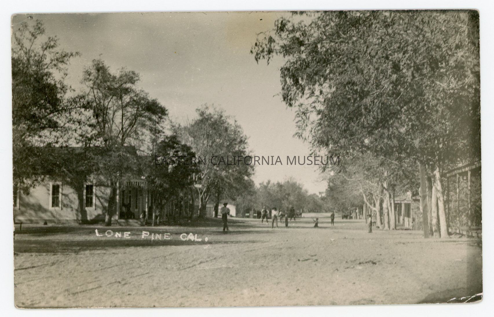 Photo postcard titled, "Lone Pine, Cal." It was almost certainly taken by photographer Fred Harvey. It shows a dirt road and what appears to be a group of youngsters playing a ball game. It was sent to Miss E. E. McCutchen in Avalon, Catalina Island from "W." in Lone Pine on July 31, 1909. It has a green one cent Benjamin Franklin stamp.