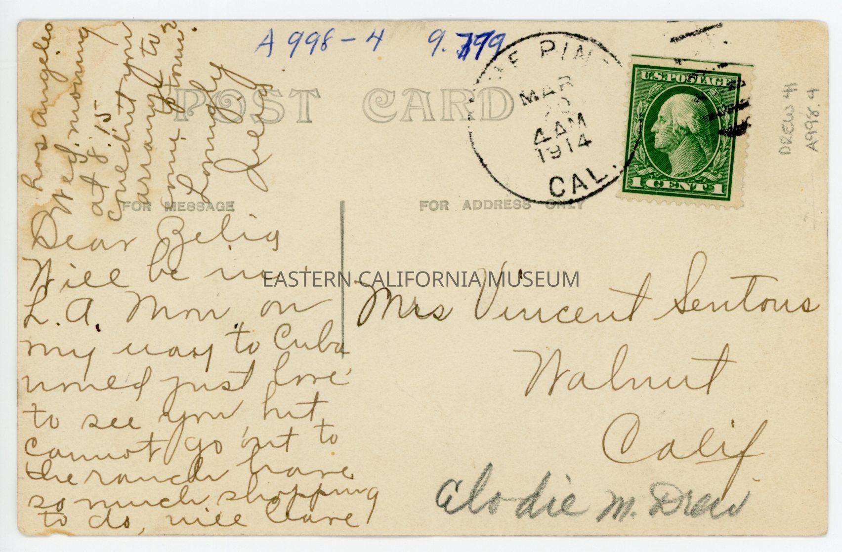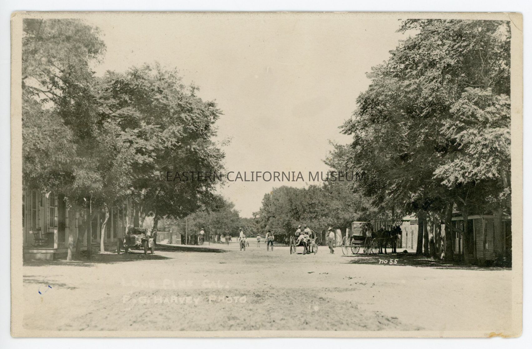 Photo postcard titled, "Lone Pine, Cal." taken by F. G. Harvey and given his ID #55. It was sent to Mrs. Vincent Sentous [Zelia Meysan] in Walnut, CA from Julia. Sent from Lone Pine on March 20, 1914. Has a green one cent Washington stamp.Photograph Details