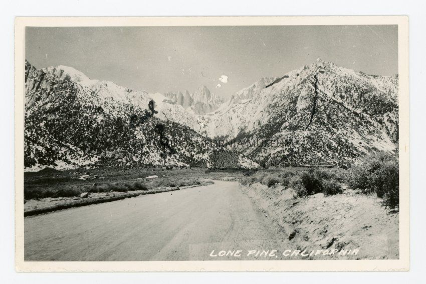 Photo postcard titled, "Lone Pine, California." Shows a dirt road leading towards the Sierra Nevada and Mt. Whitney. It appears someone has drawn a little stick figure in the foothills in black ink and labeled it "Carl" along with lines likely showing his hiking path.Photograph Details