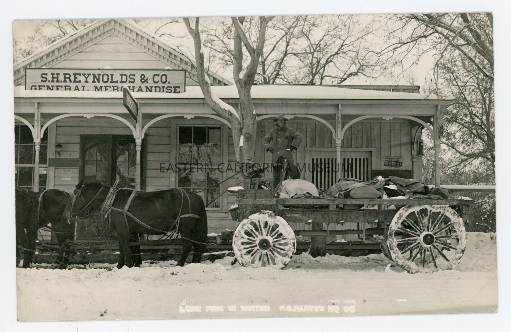 Photo postcard titled, "Lone Pine in Winter" taken by photographer Fred Harvey and given his ID #86. It shows the S. H. Reynolds and Co. General Merchandise store with a wagon parked in front of it. There is an unidentified man standing on the wagon.Photograph Details