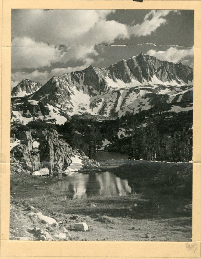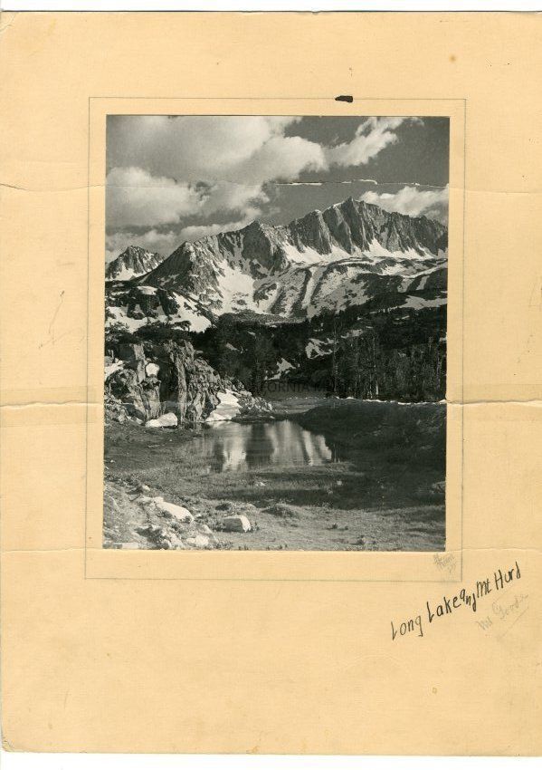Oversized mounted photo labeled, "Long Lake and Mt. Hurd" with "Mt. Goode" in pencil beneath. Photographer signed the piece in lower right corner, looks like J. M. McKinnis, '35. In poor condition--looks like it was folded or bent in multiple places.