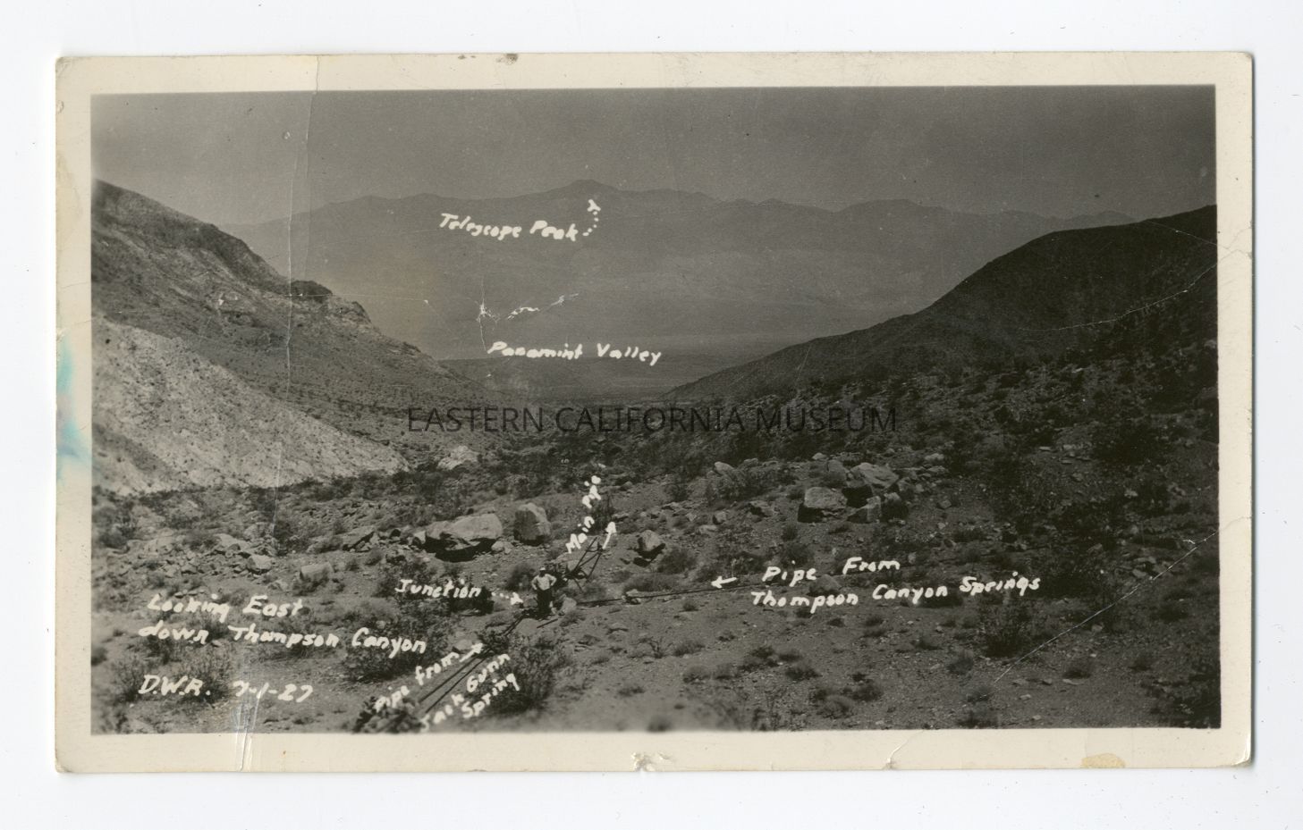 Exterior photo of a desert landscape. There is one person in the middle and several areas that have been labeled in white. They say "Telescope Peak," "Panamint Valley," "main pipe," "pipe from Thompson Canyon Springs," "pipe from Jack Gunn Spring," "junction," and "Looking East down Thompson Canyon, D.W.R. 7-1-27."