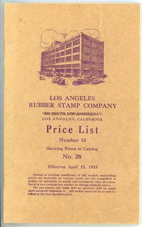 "Los Angeles Rubber Stamp Company Price List, No. 18, Showing Prices in Catalog No. 28, Effective April 15, 1933"Publication Details