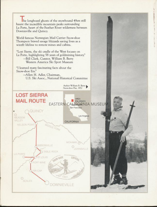 The Lost Sierra, California Northern Mines region of the Sierra Nevada, sprang to life during the gold rush. In 1850 prospectors flocked to its rich diggings, dug 93 million in gold by 1911. Many miners died in the winter of 1852-53, trapped by 30 foot snowdrifts. Next winter miners sported skis, then known as Norwegian "snow-shoes." Soon the region swarmed with men, women & children sliding about on snow-shoes. Doctors, Expressmen, mailmen, including famed Snow-Shoe Thompson, tracked the region on skis. La Porte, first gold site, welcomed winter sports. In 1868 La Porte's Alturas Snow-shoe Club staged the world's first organized downhill ski races. Miners hit up to 80 mph, racing for rich gold purses on skis 12 feet long! "I learned many fascinating facts about the Snow-shoe Era from your book," Allen H. Adler, Chair W.S. Ski Assn., Nat. Historical Committee. Rugged terrain cut the Lost Sierra from the rest of the world. Three forks of the mighty Feather River lace its forests with deep canyons. Rivers left towering peaks & sharp ridges. Quincy, Plumas County seat, stands at the northern gateway; Marysville guards the West; Downieville borders the south, Johnsville, headquarters of today's Plumas Eureka State Park, faces east. The Lost Sierra became deserted as mining towns, except La Porte, died. (source: Editorial Review/Amazon.)