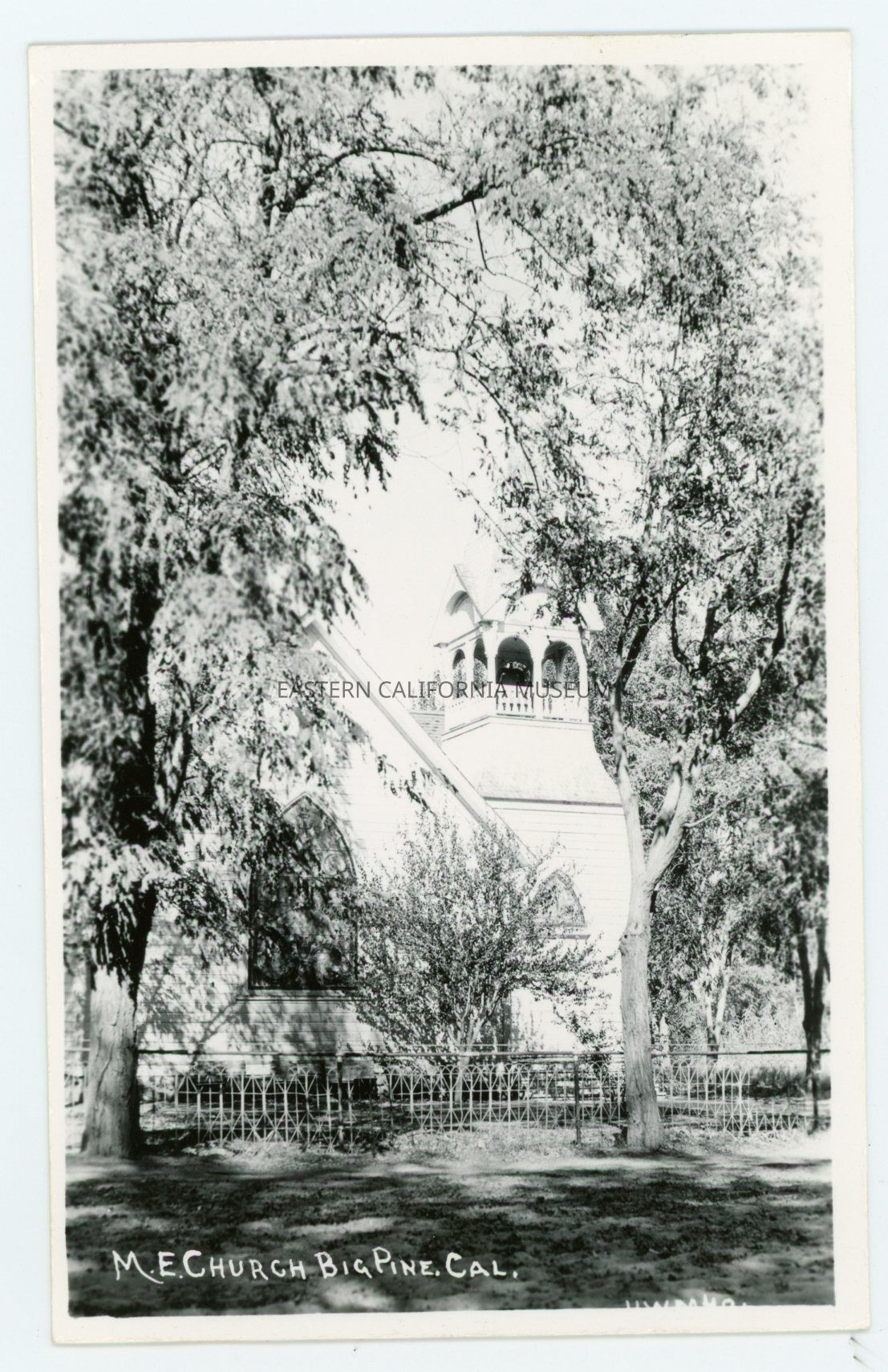 Photo postcard titled "M.E. Church, Big Pine, Cal." taken by Harry W. Mendenhall (his ID # is illegible, but looks to be a number in the 40s: 40A, 42A, 43A, or 49A). It shows the Methodist Church in Big Pine, which is located on the corner of Crocker and School Streets.Photograph Details