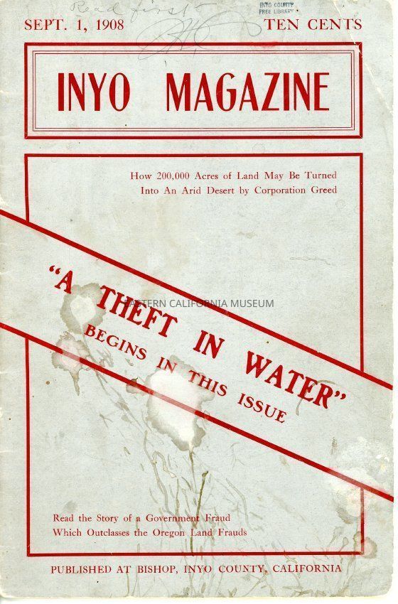Inyo Magazine, September 1, 1908. It was previously owned by the Inyo County Free Library. Water damage to cover.