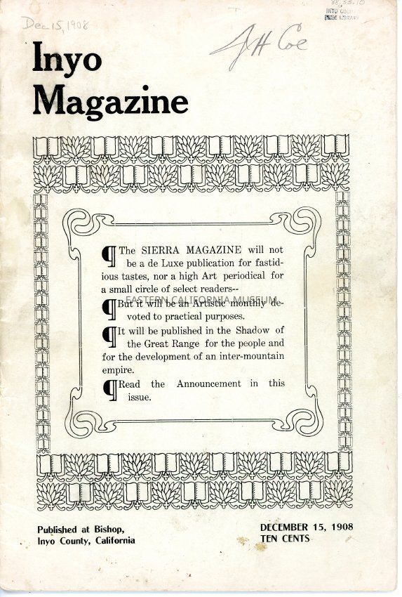 Inyo Magazine, December 15, 1908. It was previously owned by the Inyo County Free Library.