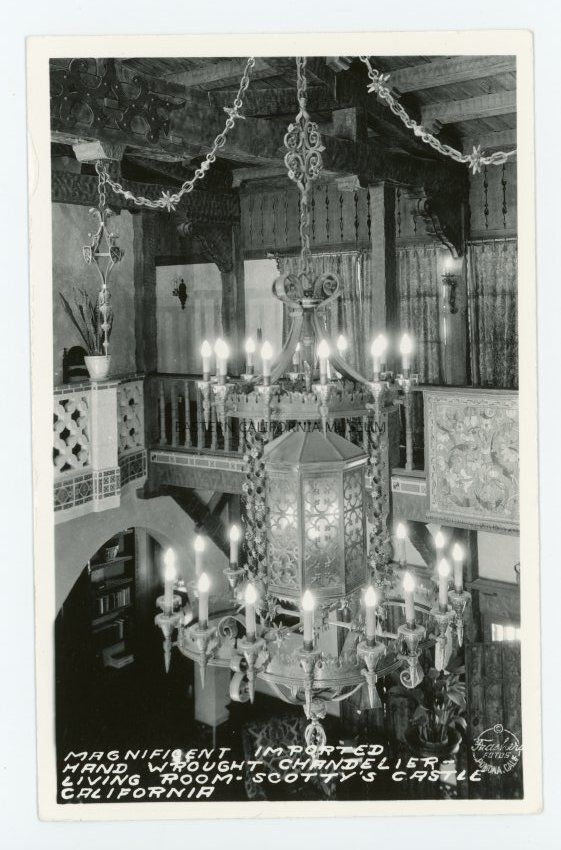 Photo postcard of Death Valley Scotty's Castle. It is labeled, "Magnificent Imported Hand Wrought Chandelier, Living Room, Scotty's Castle, California."Collection