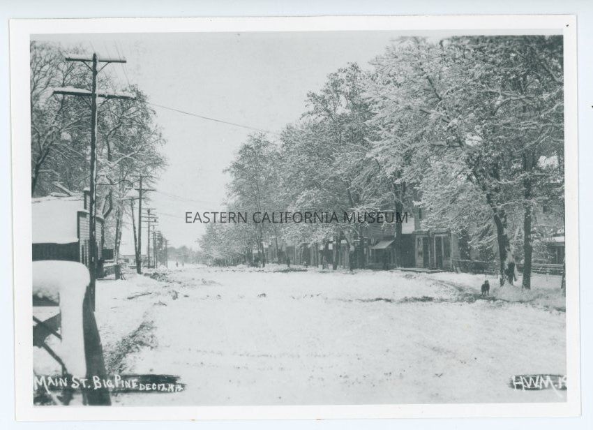 Copy of a photo titled, "Main St. Big Pine, Dec. 17, 1914" taken by photographer H. W. Mendenhall. There is a dog standing under a tree heavy with snow, road is covered in snow, buildings and telephone poles are snow covered.Photograph Details