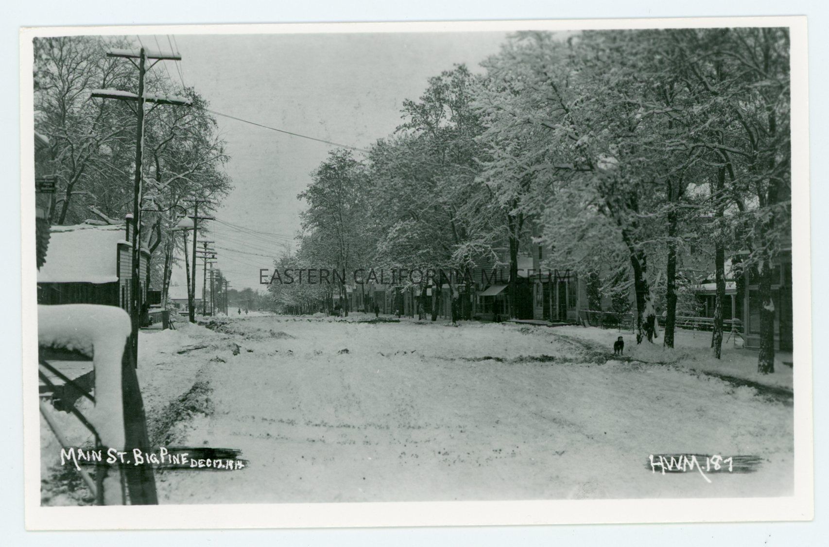 Photo postcard titled "Main St., Big Pine, Dec. 17, 1914" taken by Harry W. Mendenhall and given his ID #187. There is a lot of snow on the road, trees, and buildings.Photograph Details