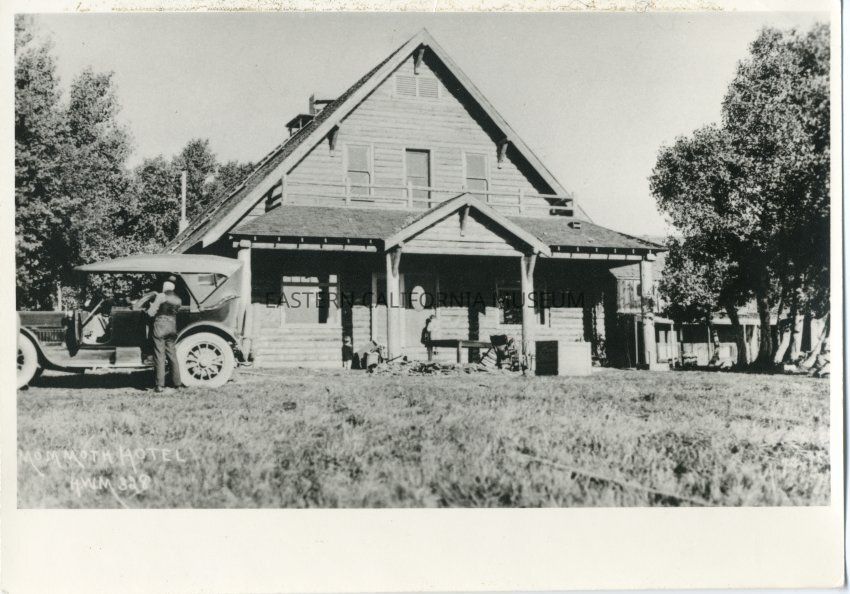B&W matte print: 2 story wood sided building, front door with round window, early model car in front with 1 man and 2 children