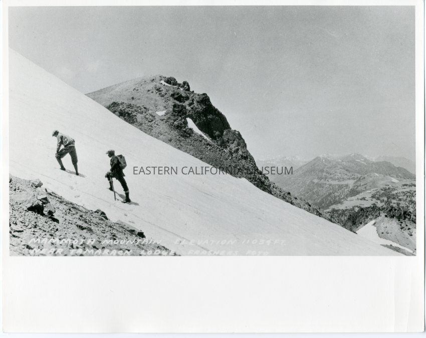 B&W matte print: 2 climbers on snowfield on backside of Mammoth Mountain