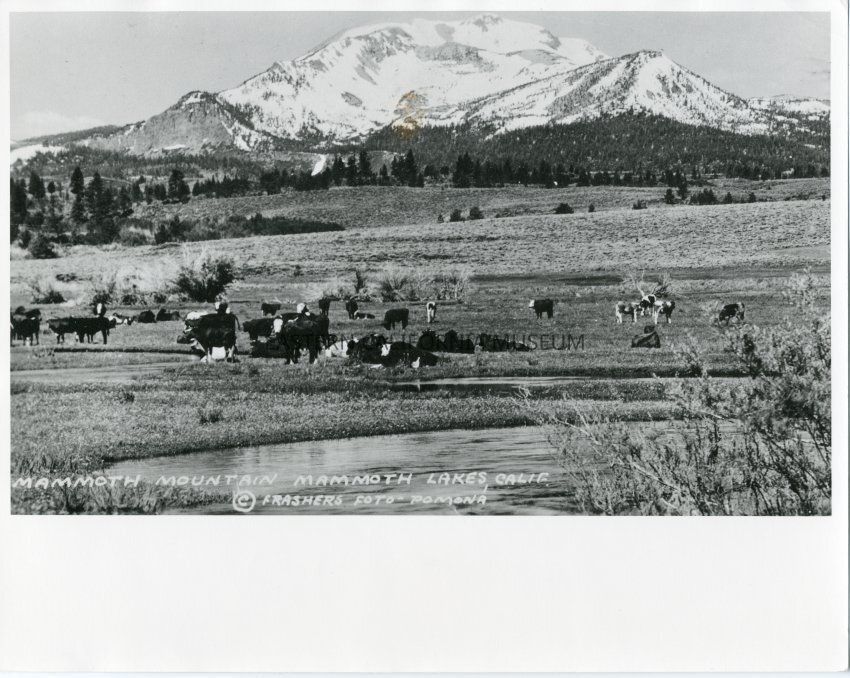 B&W matte print: cattle grazing in meadow with Mammoth Mountain in the background