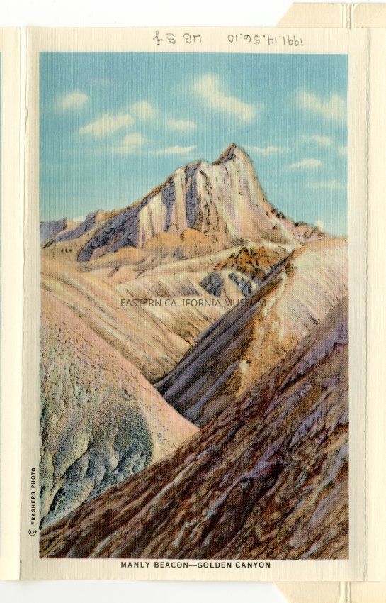 Color print of a mountain landscape in Death Valley. It is labeled, "Manly Beacon, Golden Canyon." It is on textured paper.