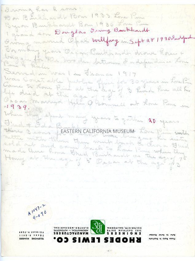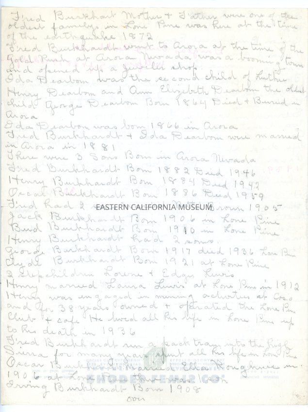 One double-sided sheet of paper handwritten in pencil and some red ink giving the history of the Burkhardt family. The paper has letterhead for Rhodes Lewis Co.Collection