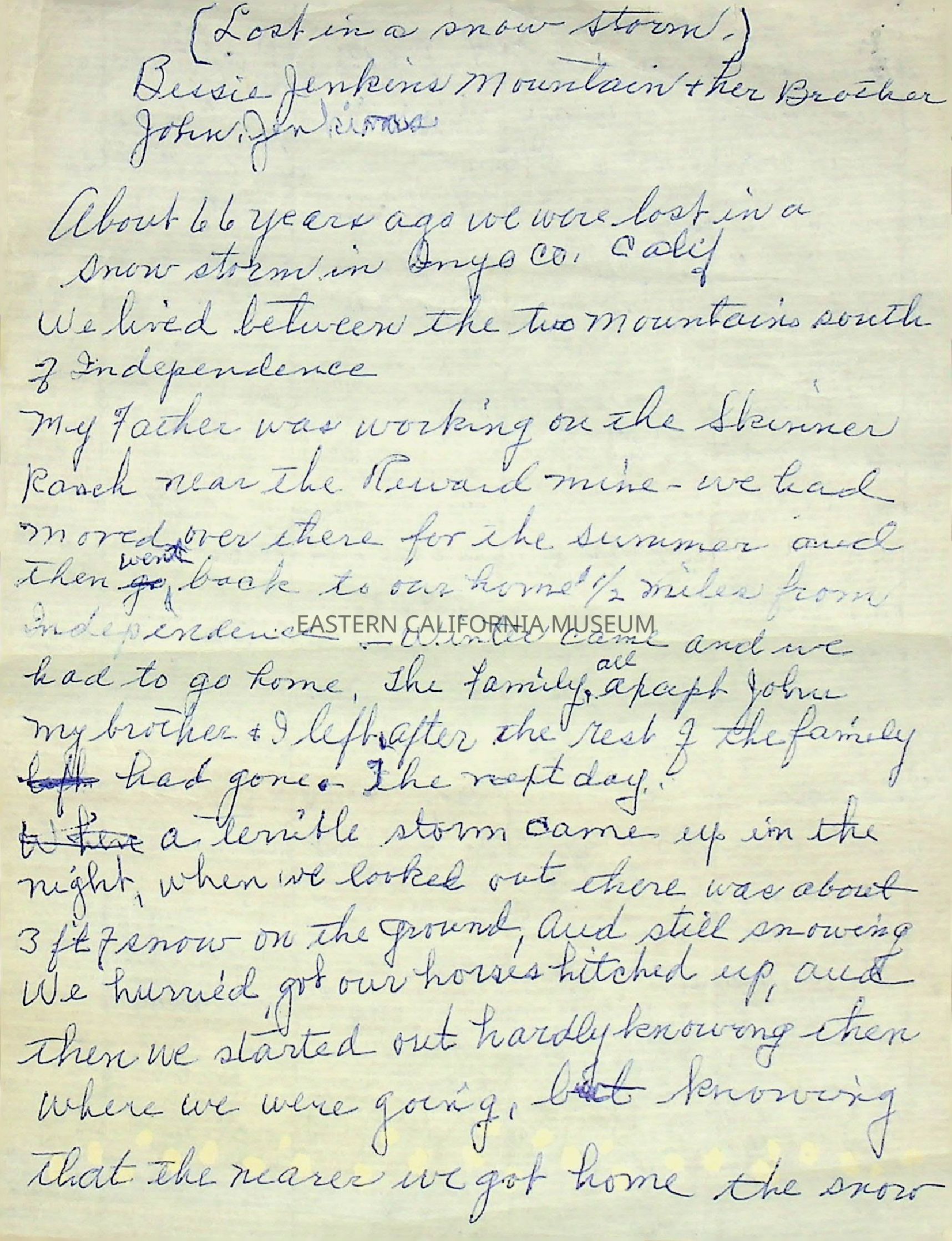 Eight manuscript pages written by Bessie Jenkins Mountain. Several pages are titled "Lost in the Snow" and there are several poems as well.Collection