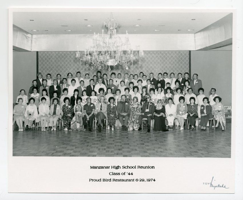 Group photo labeled, "Manzanar High School Reunion, Class of '44, Proud Bird Restaurant 6-29, 1974." Photographer Toyo Miyatake's logo embossed in lower right corner.Collection
