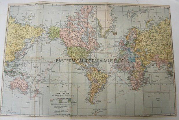 Map, color "Map of the World on Mercator's Projection" , made for Edward J. Cadigan, Inc. N. Y.; illustrated with Colonial Possesions, Steamship Routes via Panama Canal, Other Steamship Routes, Principal Through Railroads, Principal Wireless Telegraphs Stations, Submarine Cables. Copyright by C. S. Hammond & Co. N. Y.