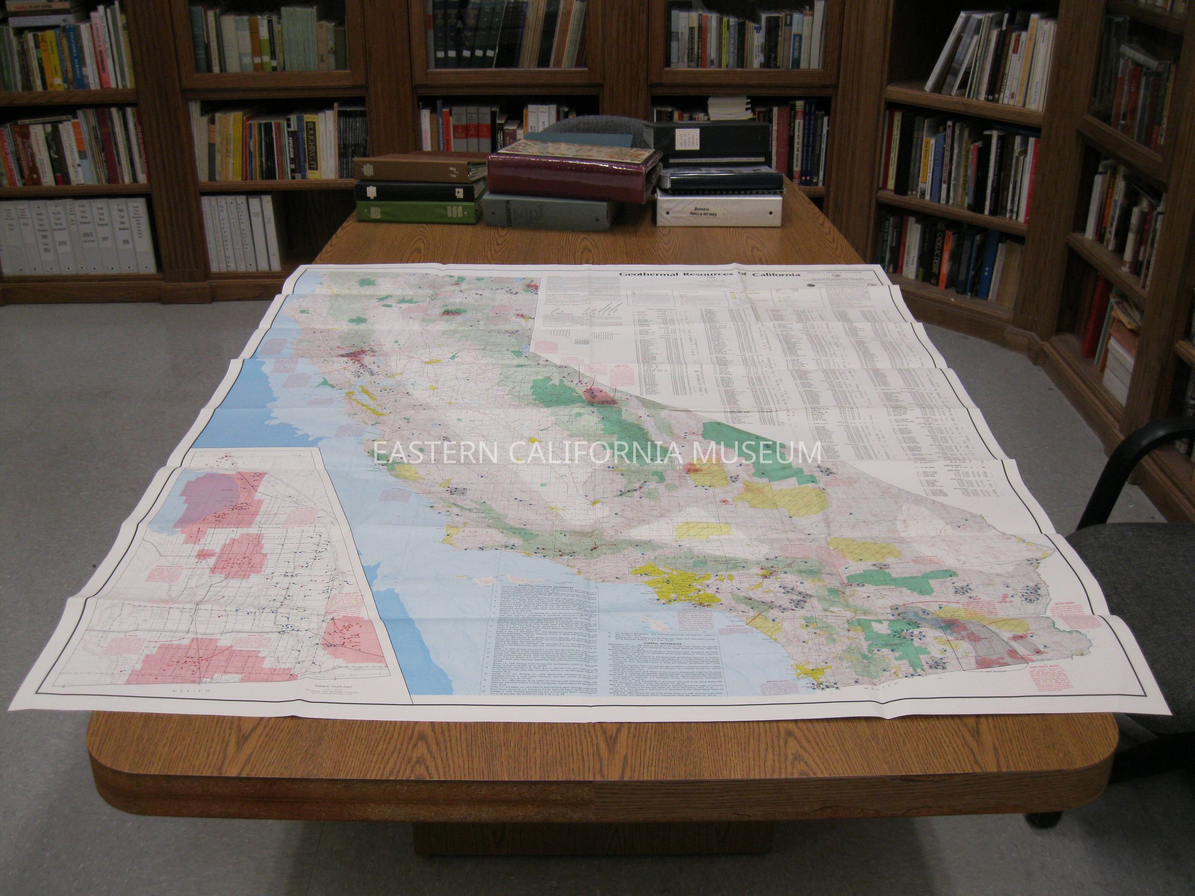 Items 2016.30.1a and 2016.30.1b are a map and the envelope it is stored it. This item is the map. It is very large and is titled: Geologic Data Map No. 4: Geothermal Resources of California. California Division of Mines and Geology, 1980. Scale is 1:750,000.